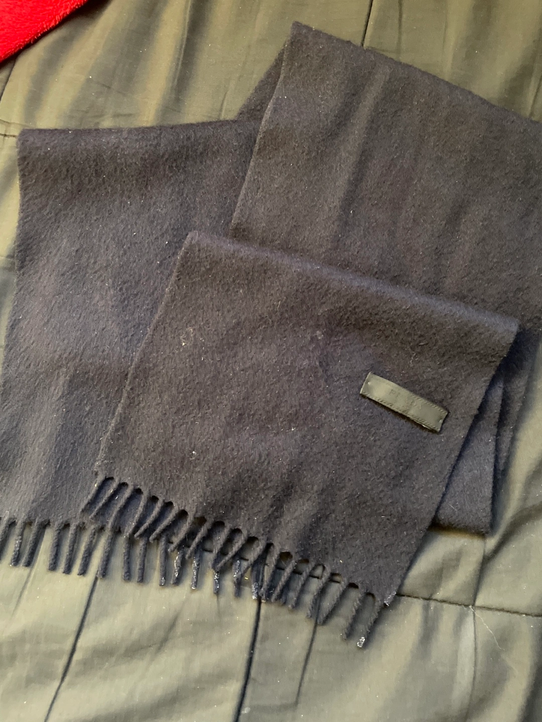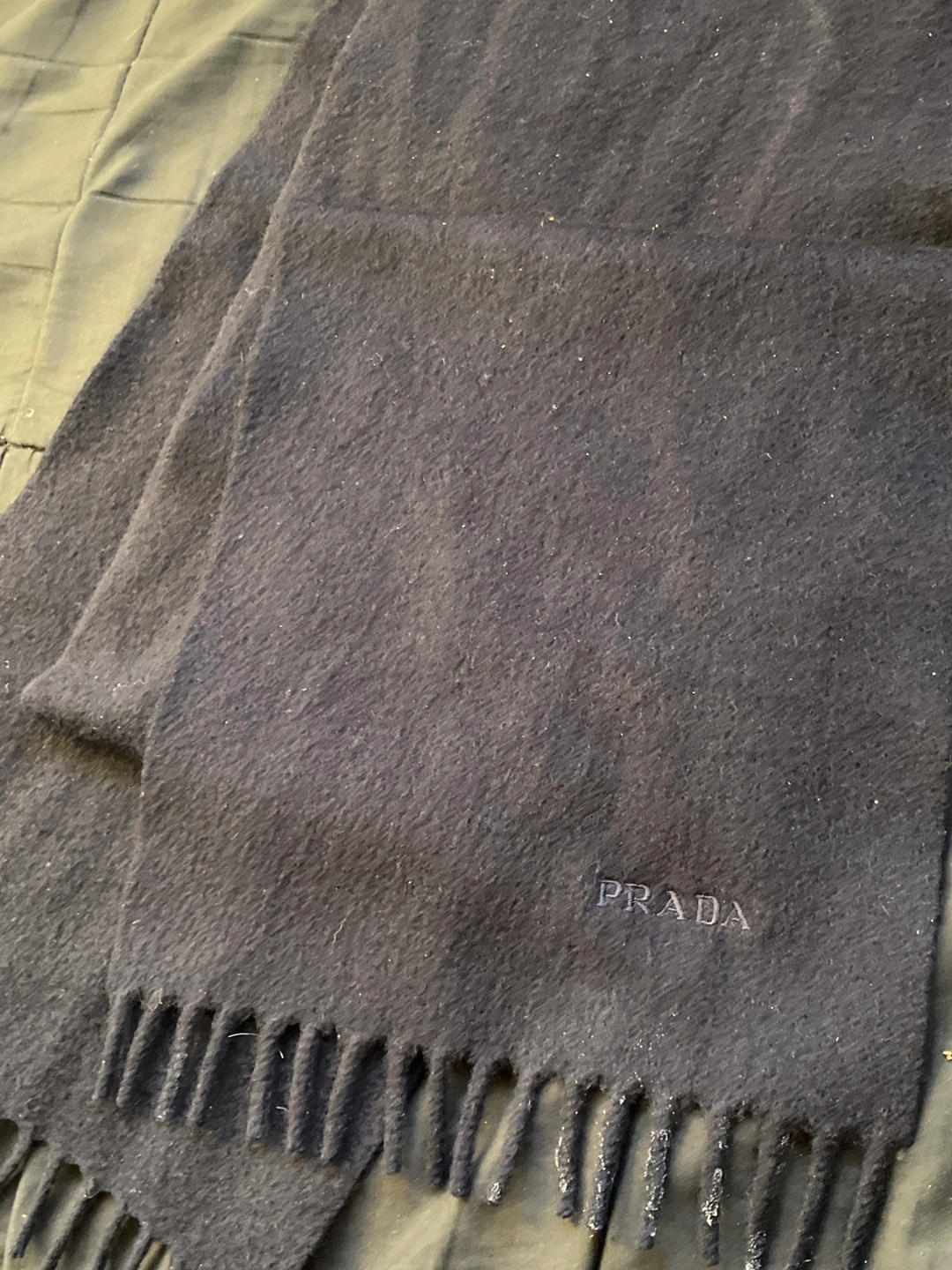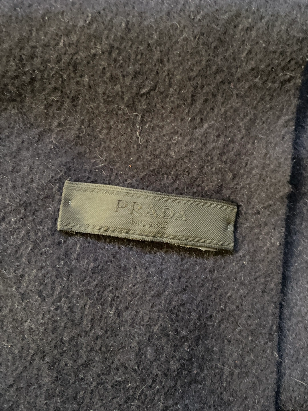Navy blue wool scarf with fringe The scarf is in relatively good condition with just some white marks at the fringe PRICE IS FIRM. ORIGINAL PRICE APPROX $800-$900. I HAVE ALREADY LISTED FOR VERY CHEAP, NOT OPEN TO OFFERS. #prada #luxury #wool #scarf #blue