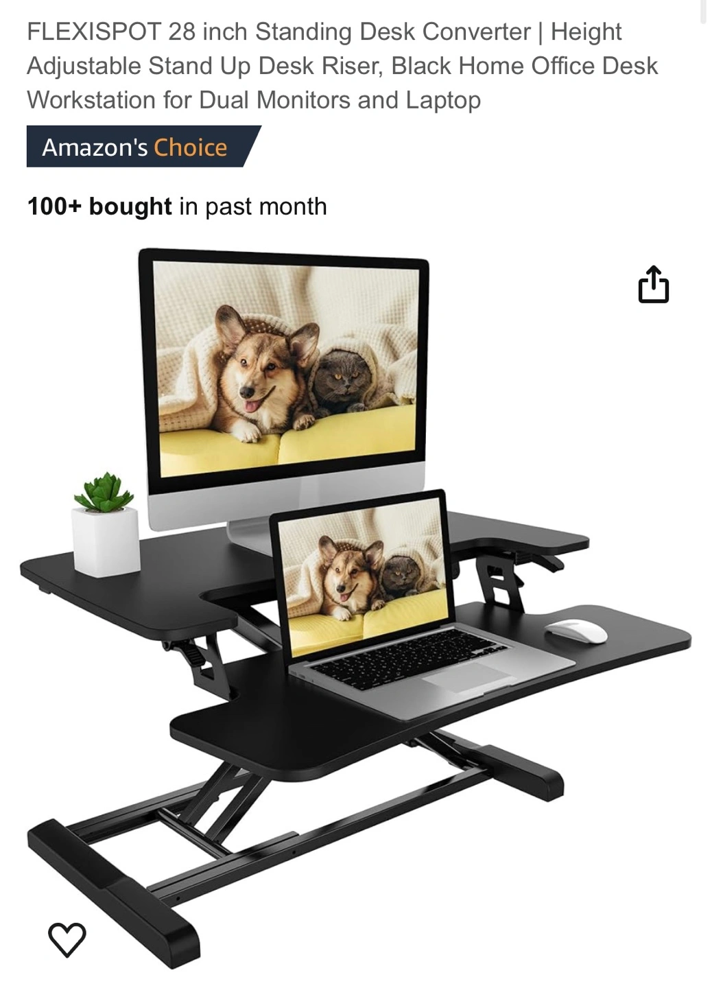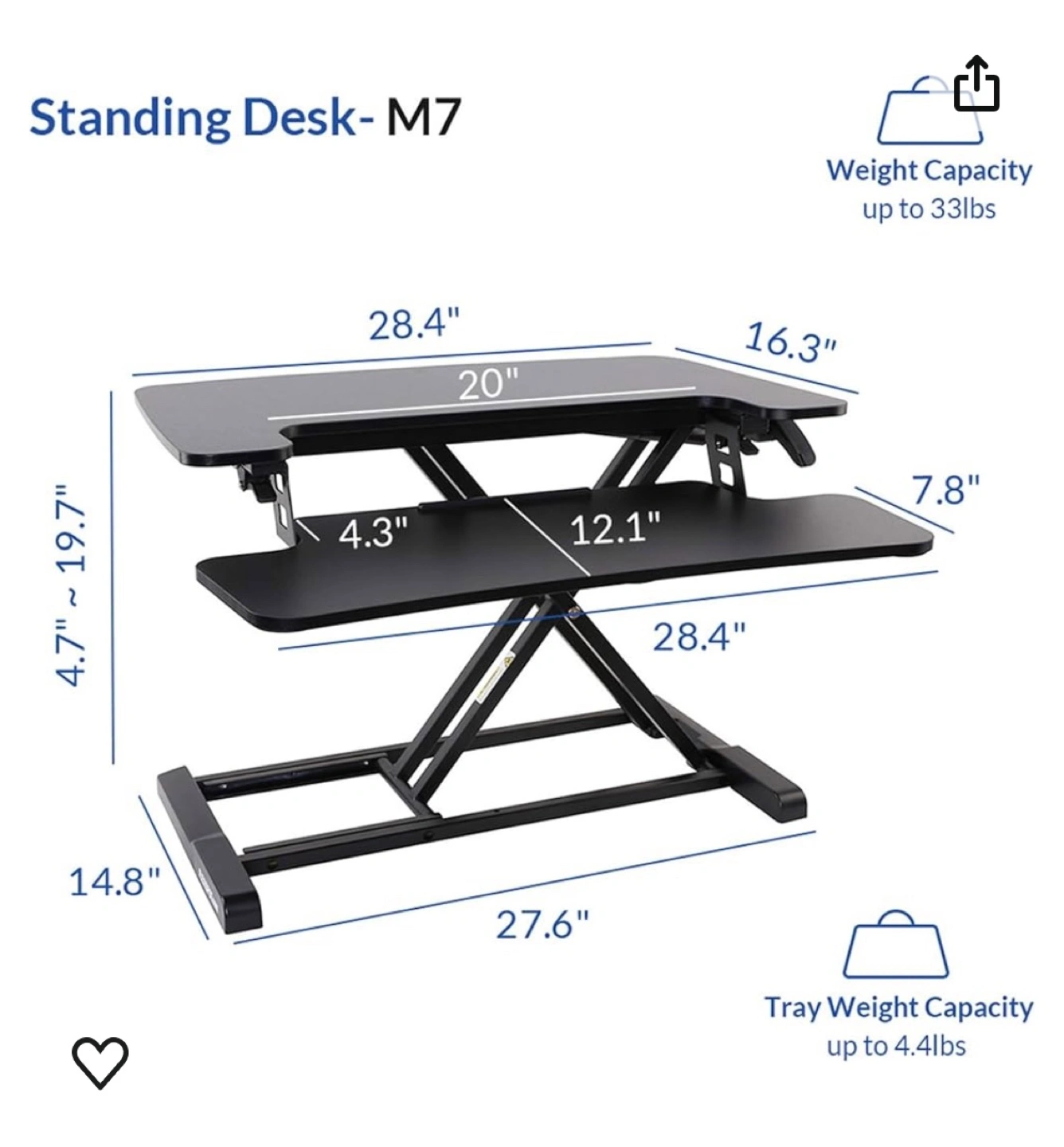 Adjustable stand up desk riser. No installation required It’s in great condition. Includes a detachable tray for keyboard or laptop. Great for dual monitor setups. For dimensions see the image Currently selling at $149+tax on Amazon. Great deal.