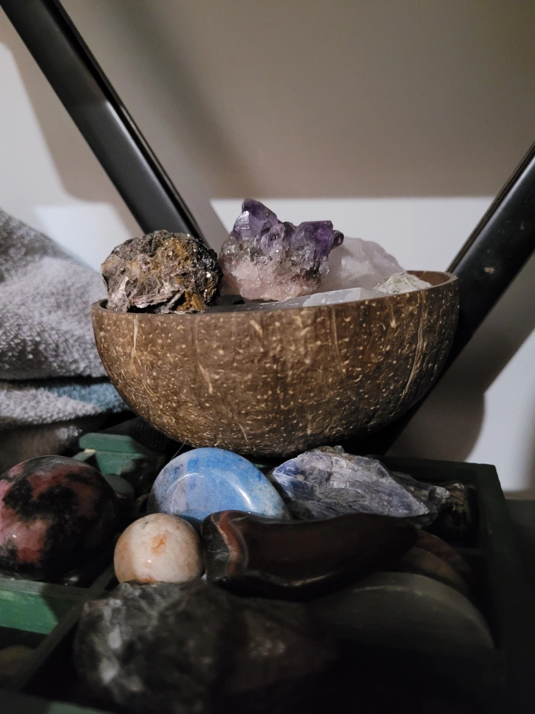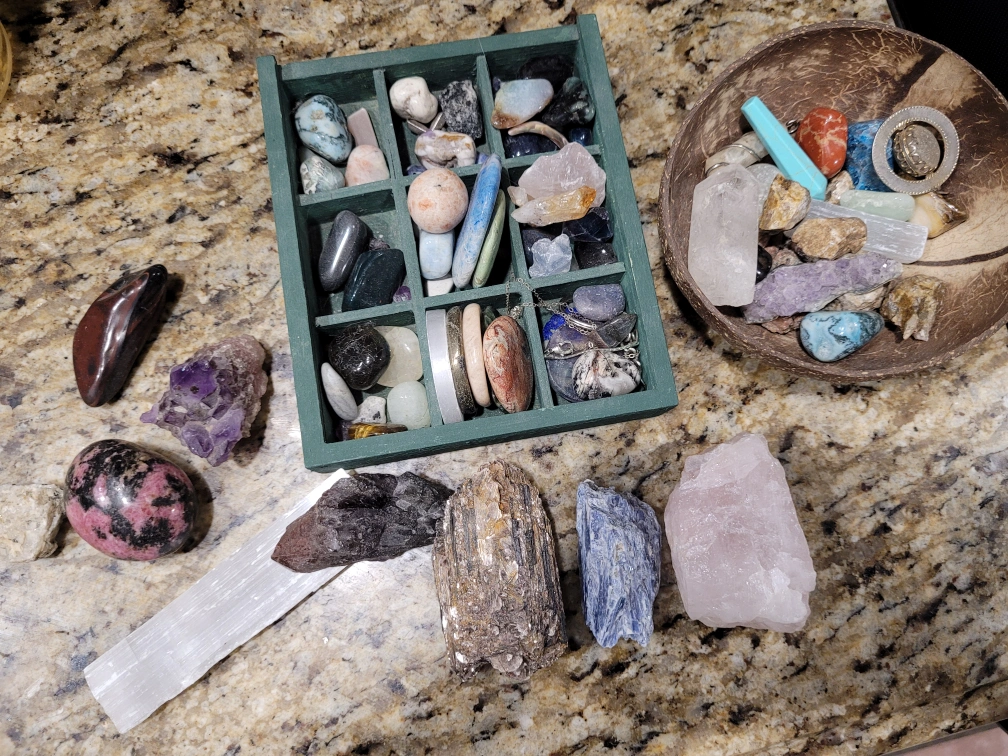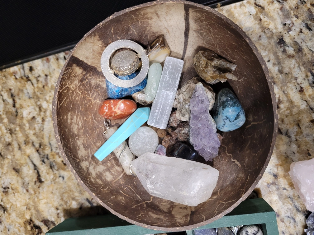 Large collection of crystals in a wooden box and two coconut bowl. Some crystals are raw, others are polished. Includes amethyst, selenite, rose quartz, blue kyanite, tiger's eye, and more. i would need to bring it from home to my storage spot for meeting up at 391 attwell drive during monday to friday 8am to 430pm. no afterhours or weekends.