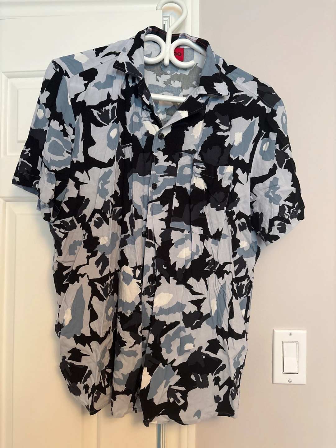 Short sleeve button up shirt with a blue, black, and white camo pattern.