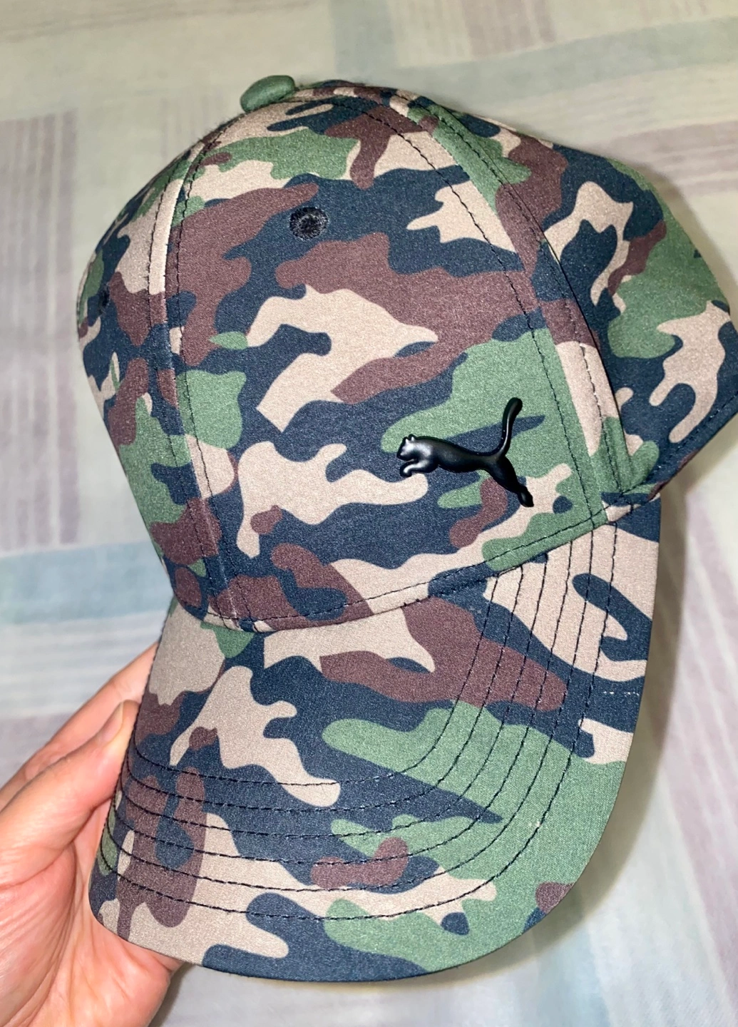 Camouflage baseball cap. Adjustable strap. Black Puma logo on the front.
