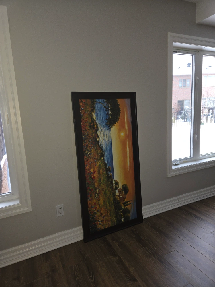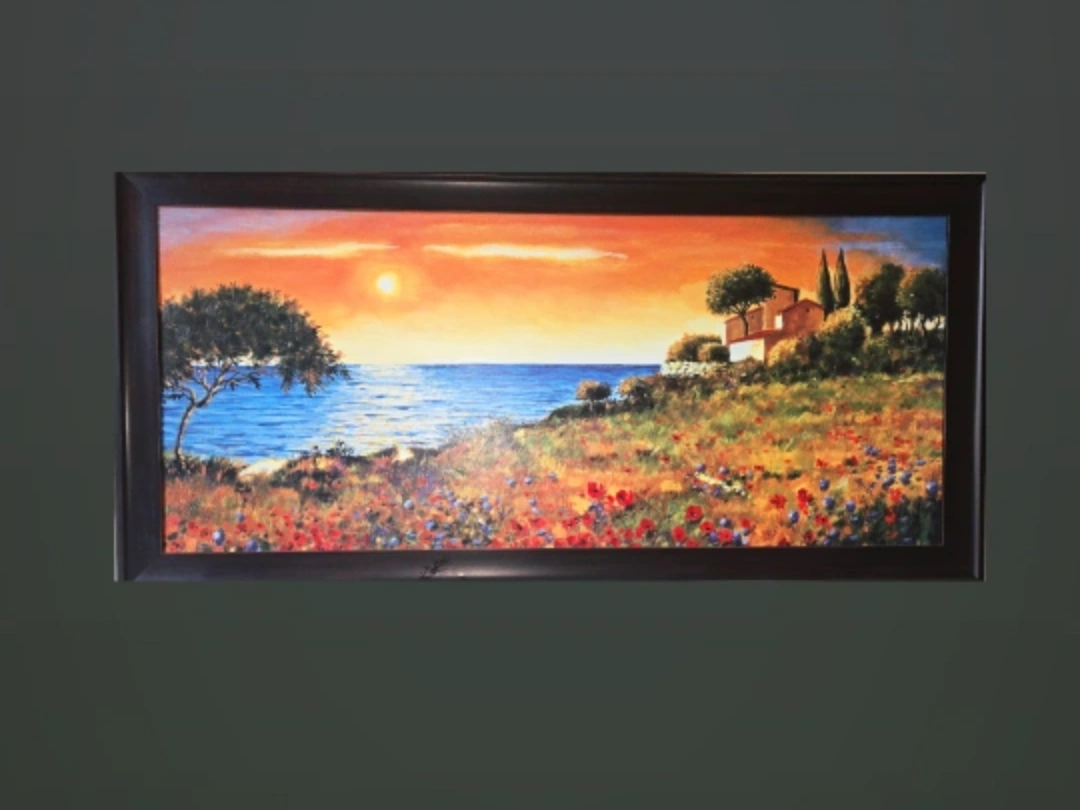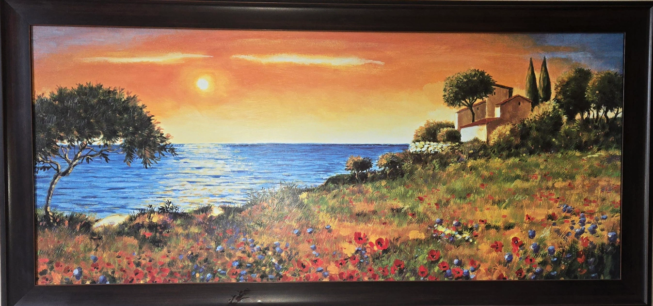 Beautiful sunset scene with flowers and a house by the sea, 28.5 × 59 inch. 11 × 28-inch print is selling for $232.59 https://www.bedbathandbeyond.ca/Home-Garden/Sunlight-Coast-by-Richard-Leblanc-Gallery-Wrapped-Canvas-Giclee-Art-11-in-x-28-in-Ready-to-Hang/26441879/product.html?option=44441053