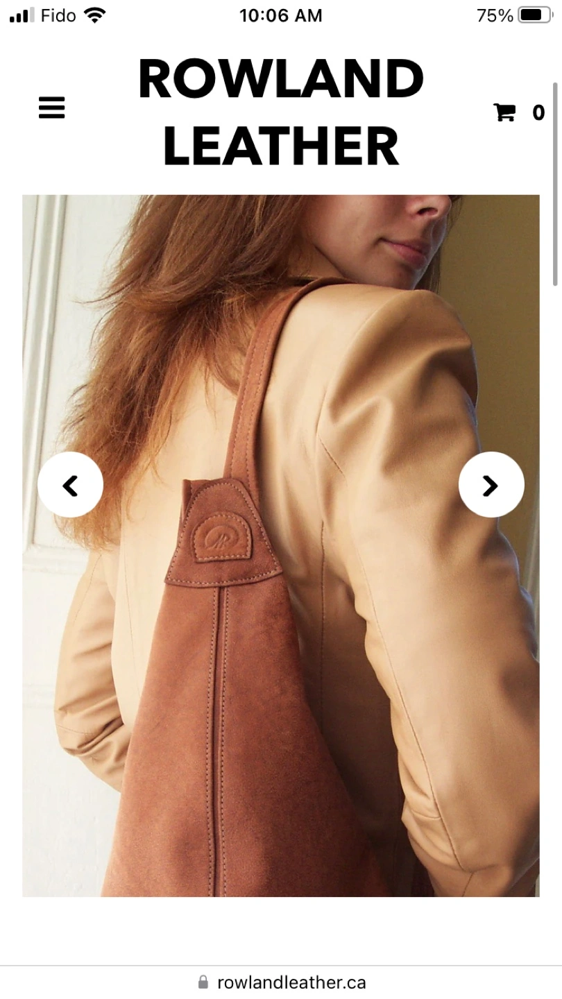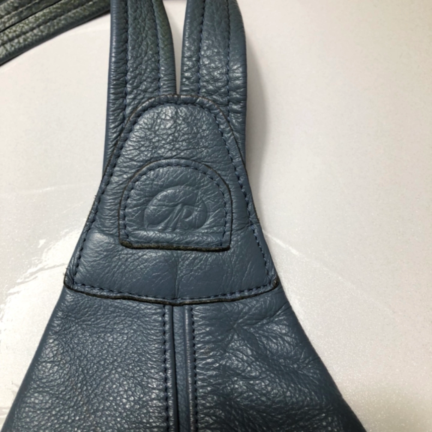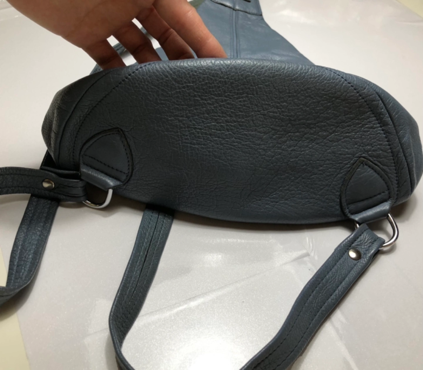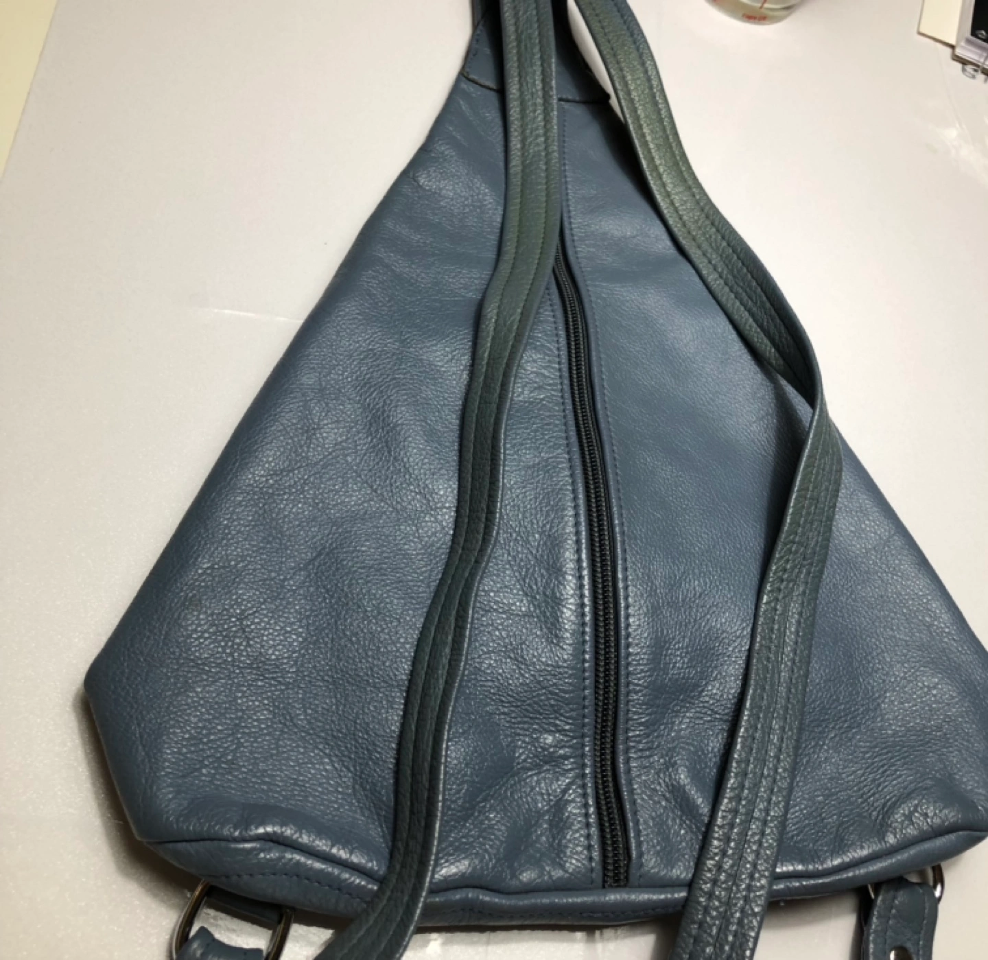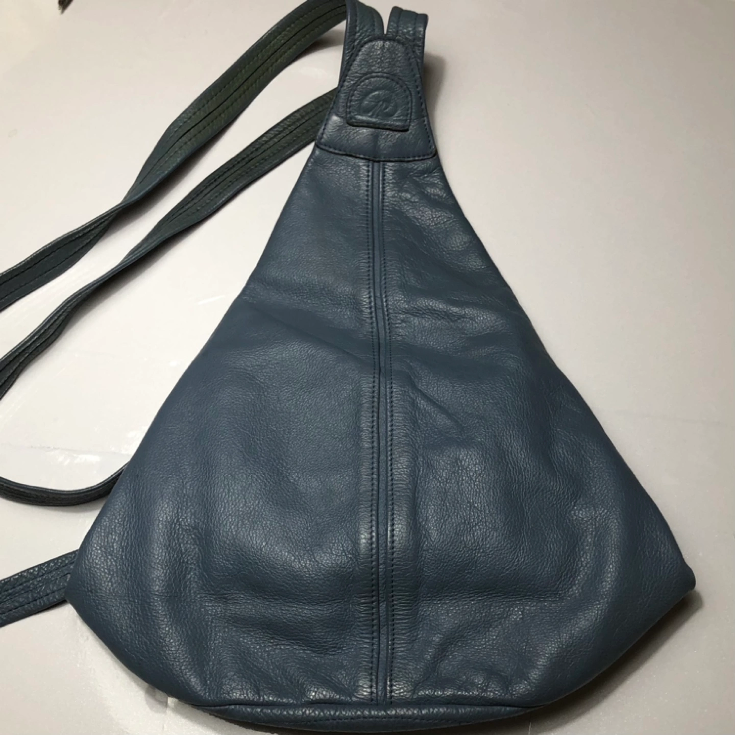 Blue leather backpack with adjustable straps. Made in Canada. Last picture from the website, for demo purposes only