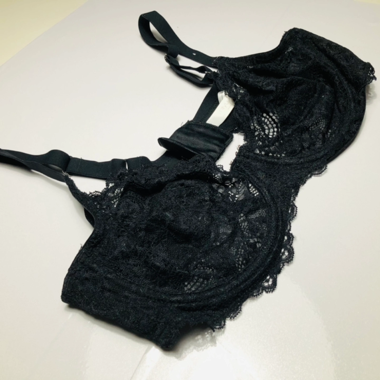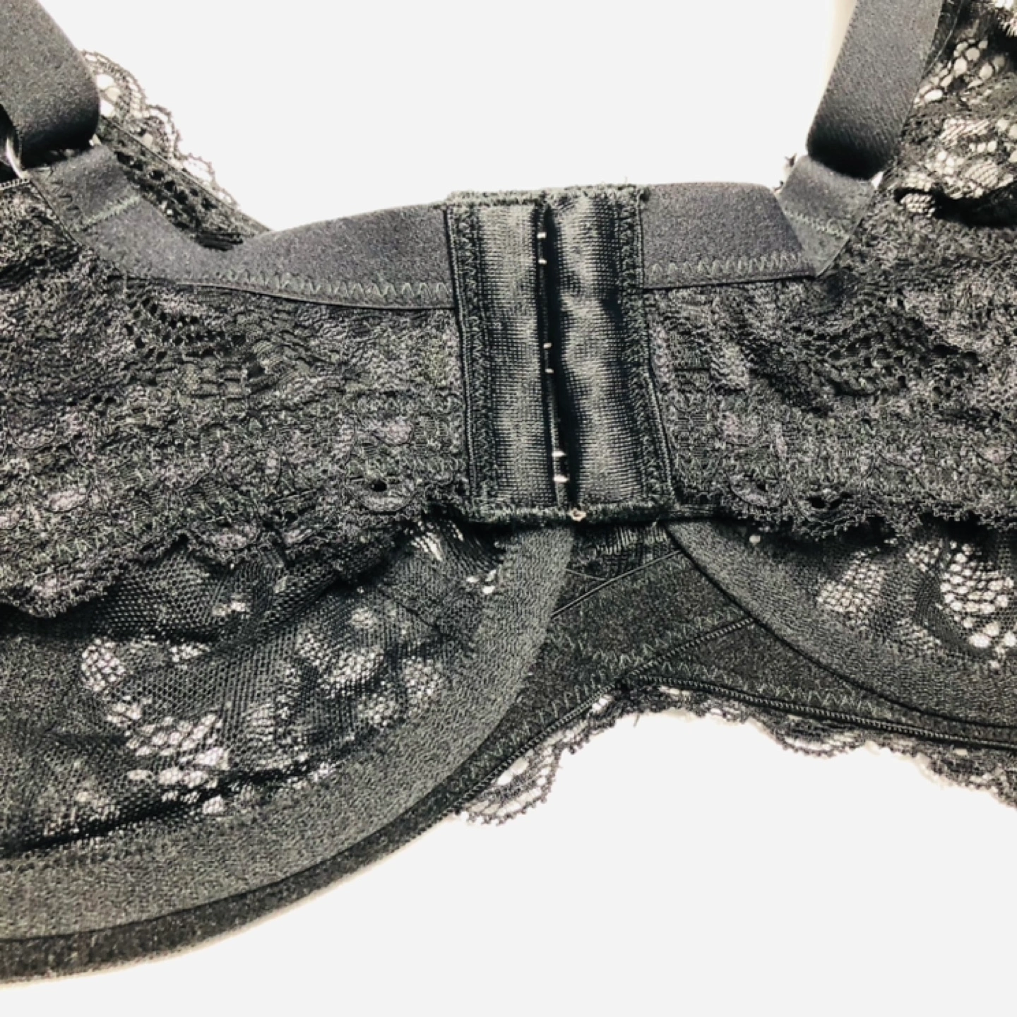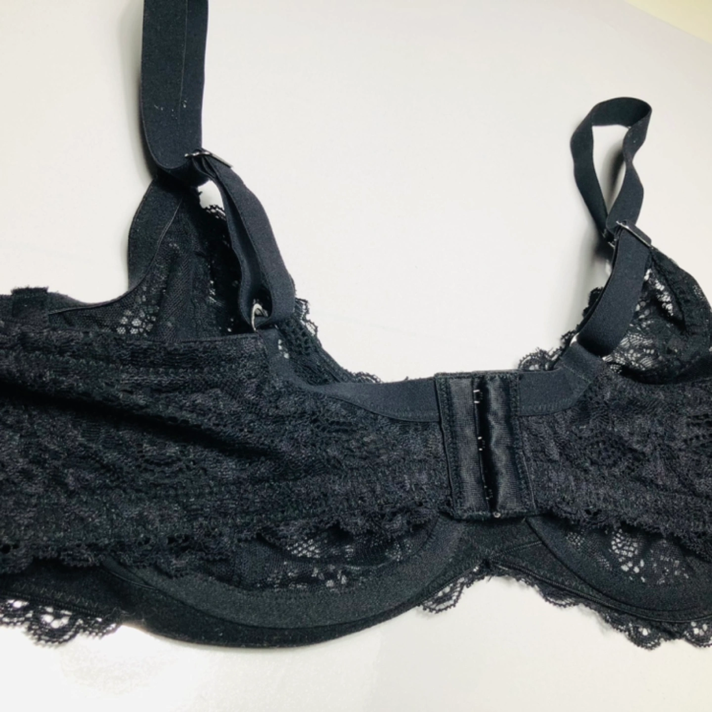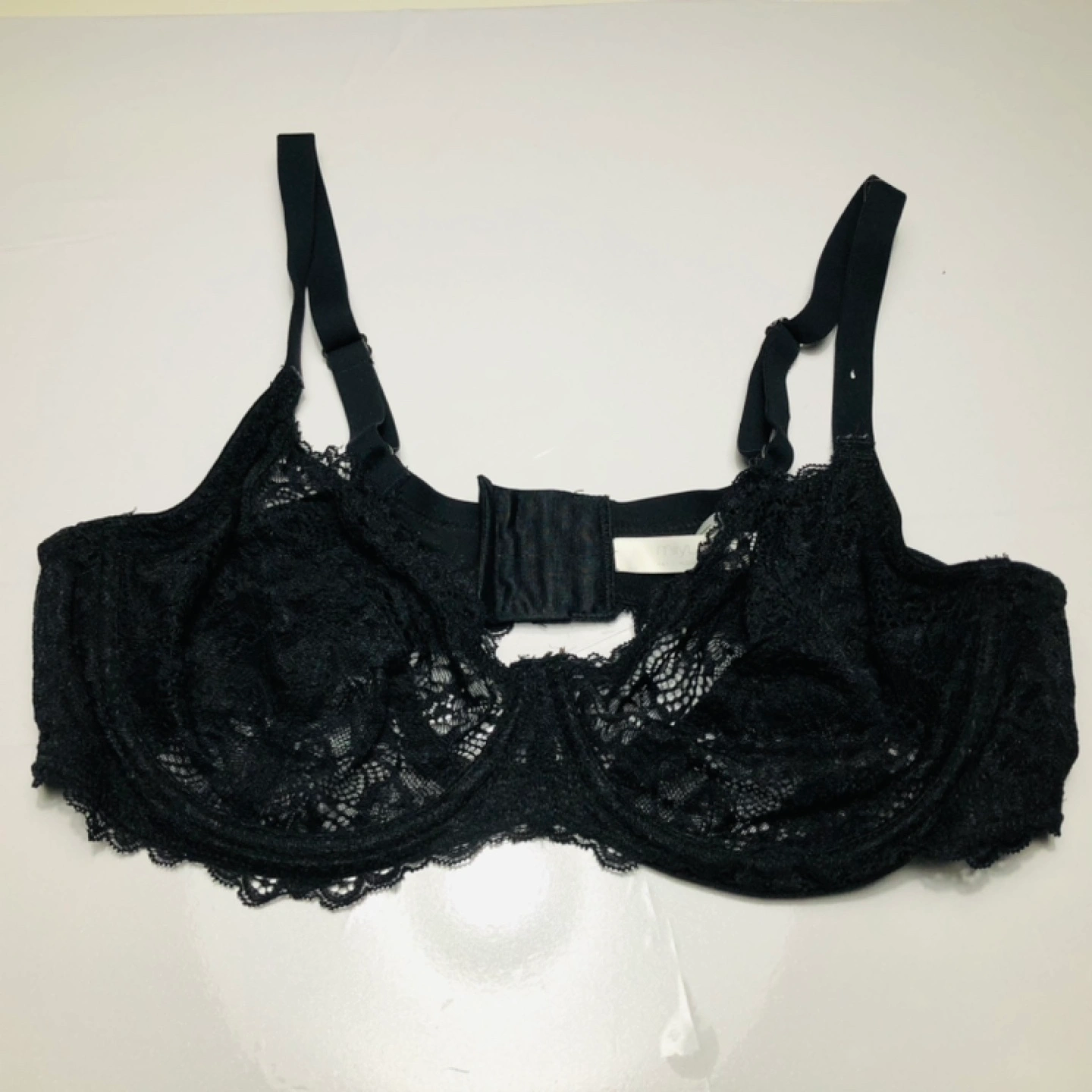 Black lace unlined bra with underwire and adjustable straps. Hook and eye closure.