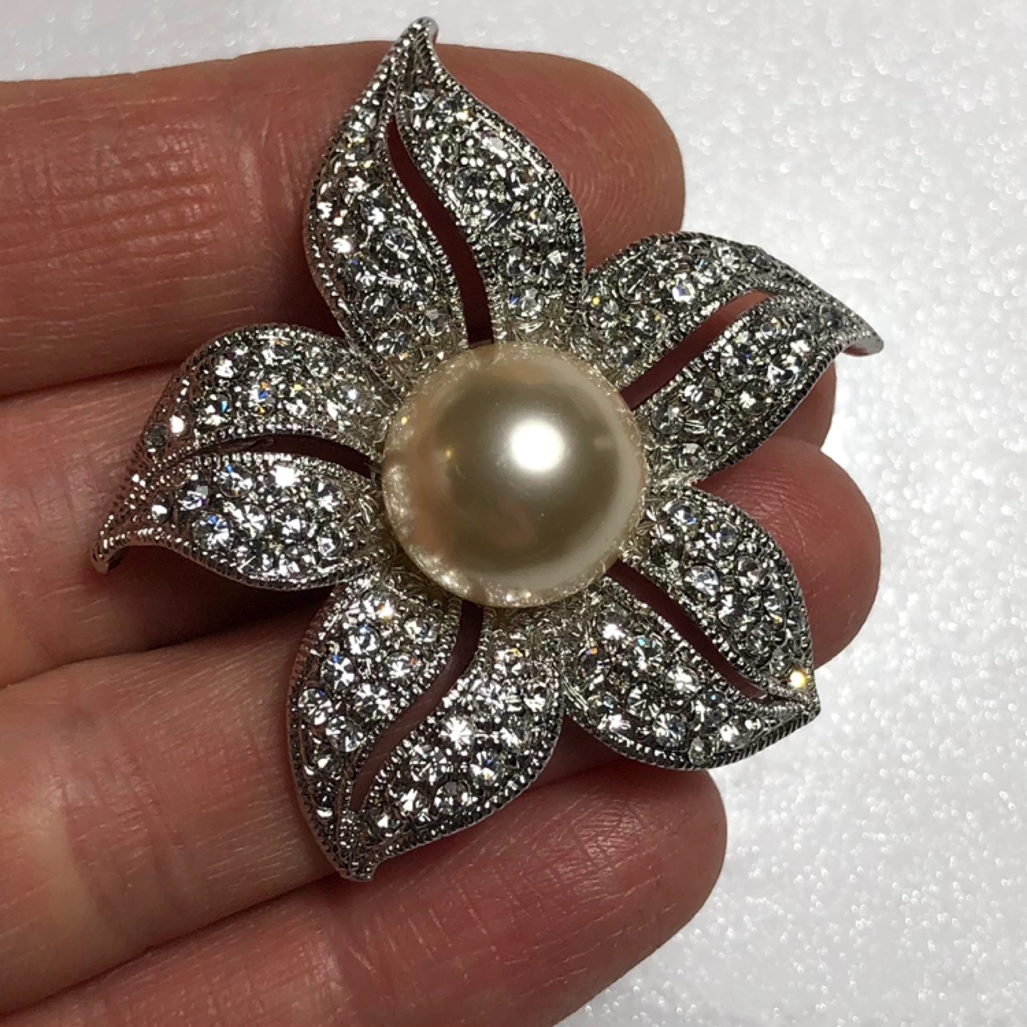 Silver tone brooch with a large faux pearl in the centre, accented with clear rhinestones. The brooch has a safety pin closure. One of a kind piece with a nice retro vibe; looks great as a hair ornament as well.