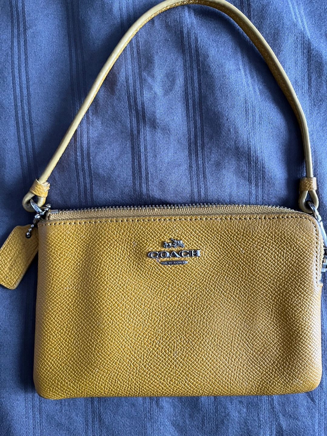 Mustard yellow wristlet with a zipper closure and a wrist strap. Has a pocket inside for cards. Good condition.