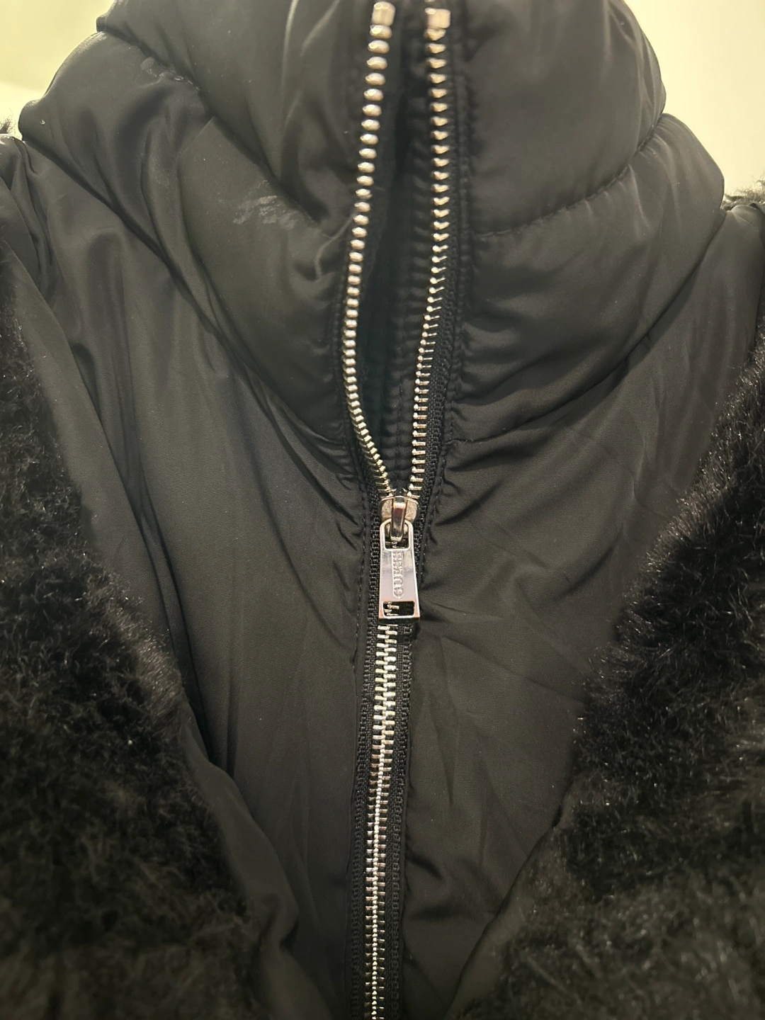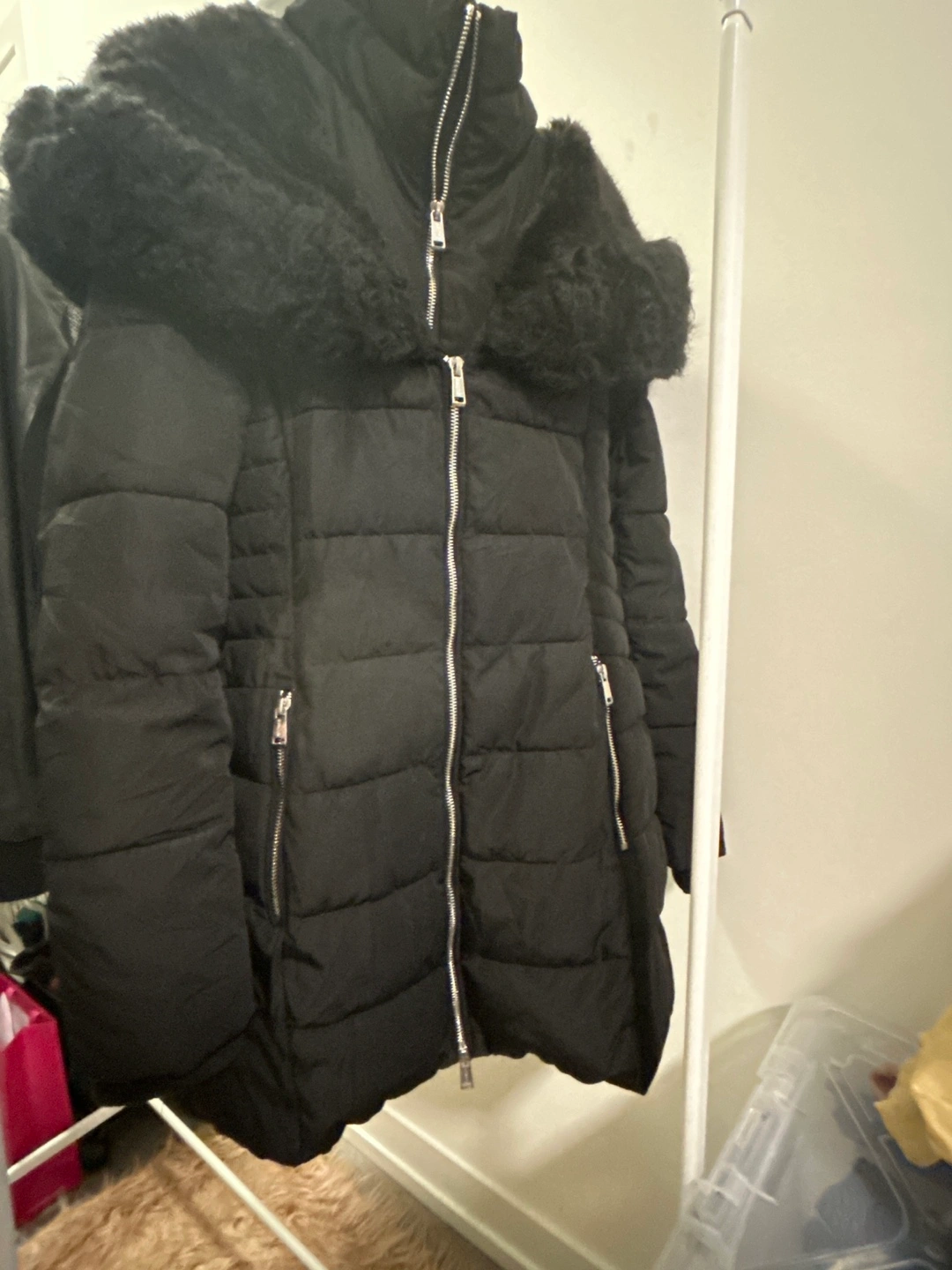 Black puffer jacket with a fur hood. Long and warm. Has zipper closure. Excellent condition Downsizing. First come first serve very warm down jacket Fits size S-M (petite M)