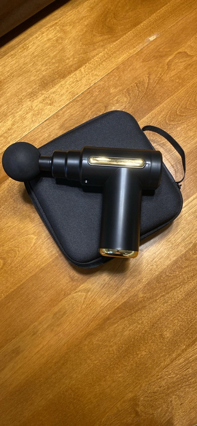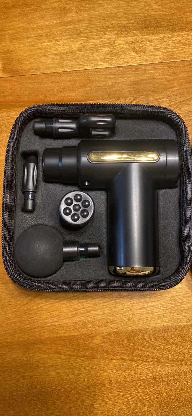 Cordless massage gun with 4 attachments and carrying case. Includes a type C charger.