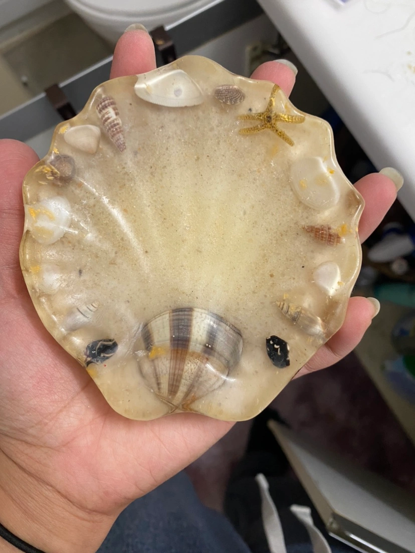 Small dish with seashells embedded in the resin. Perfect for jewellery or keys.