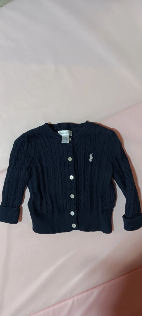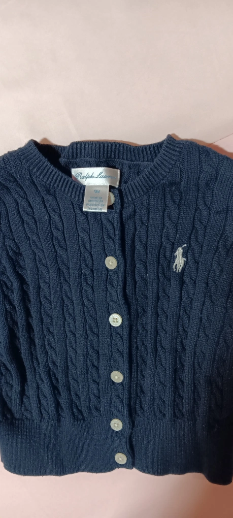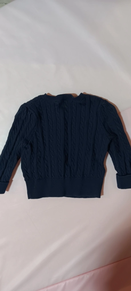 Navy blue cable knit cardigan with button closure. Long sleeves.
