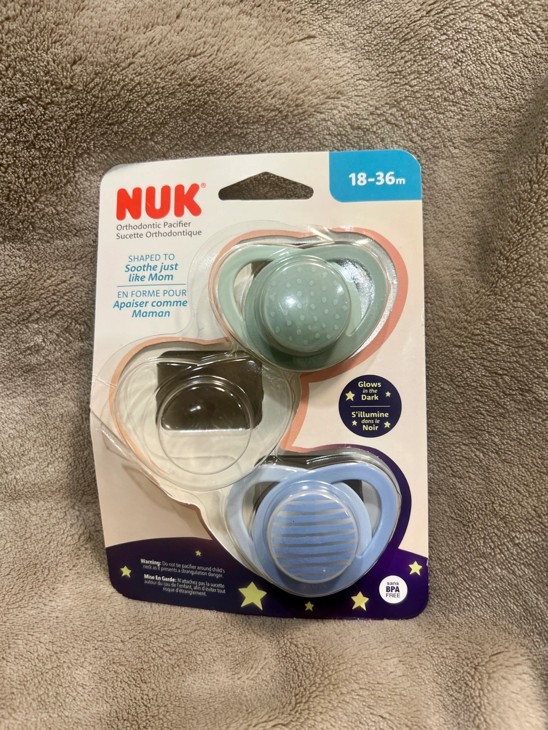 Brand new Orthodontic pacifier, glows in the dark, BPA free. Two pack, 18-36 months. Smoke and Pet Free Home