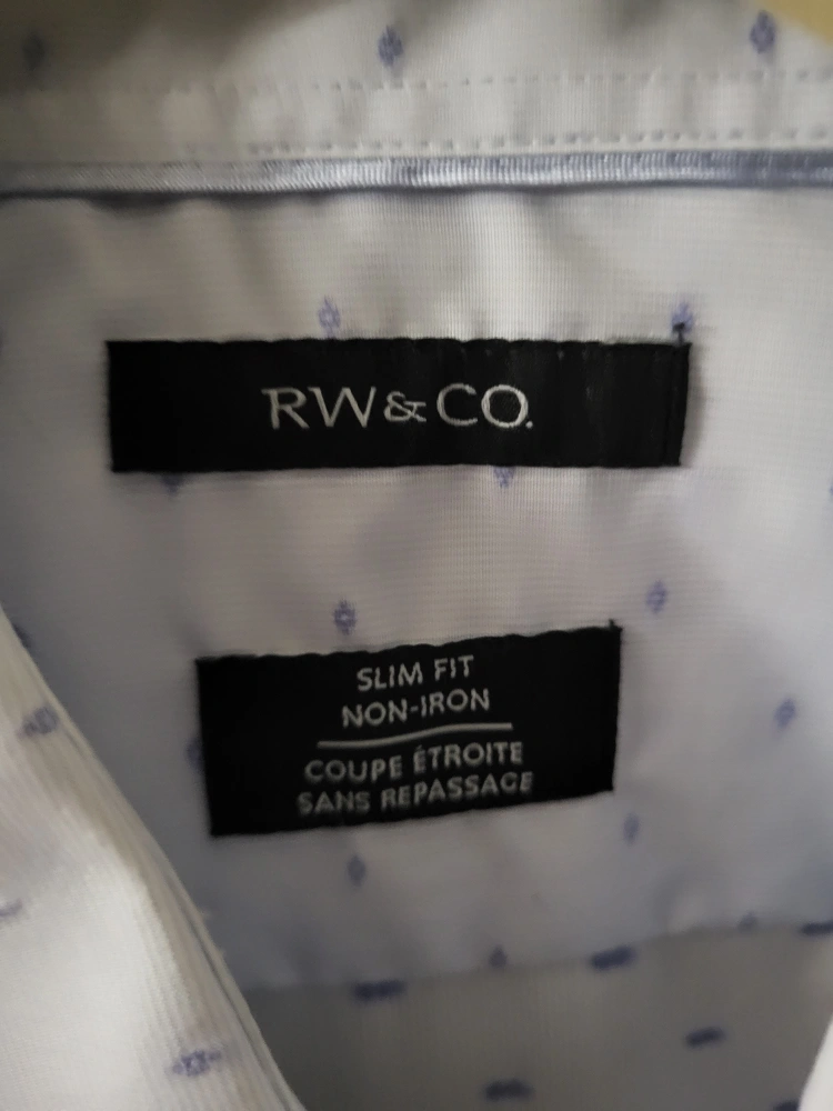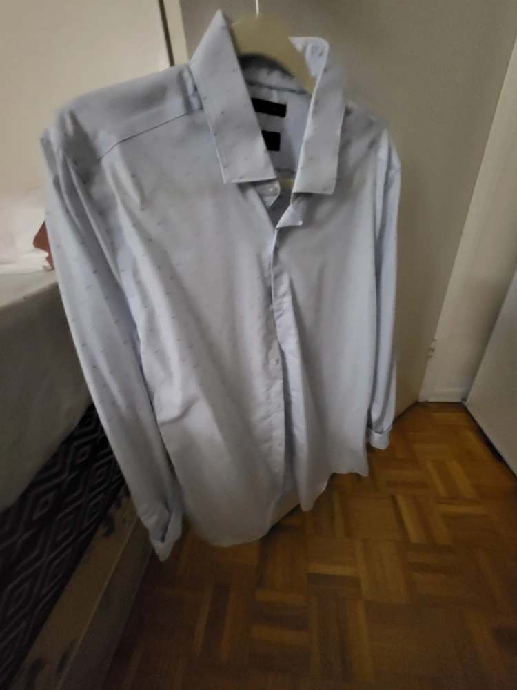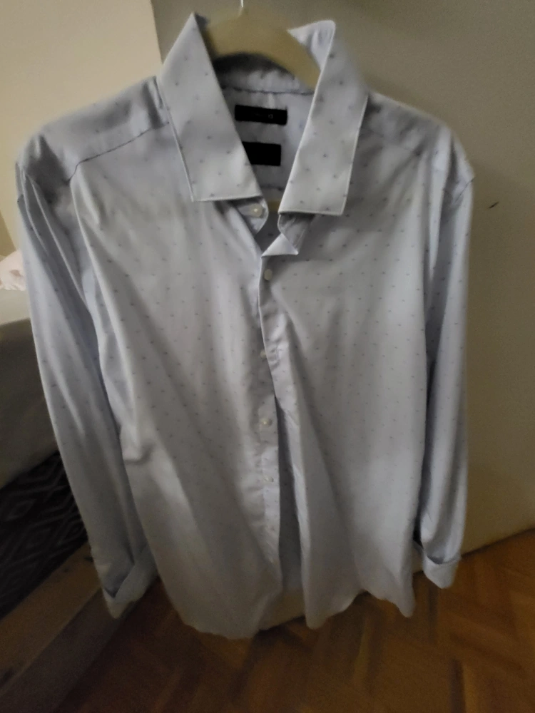 Long-sleeved dress shirt with a light blue colour and subtle pattern. Slim fit