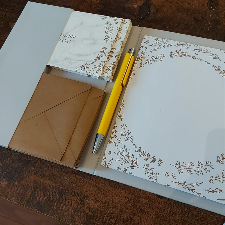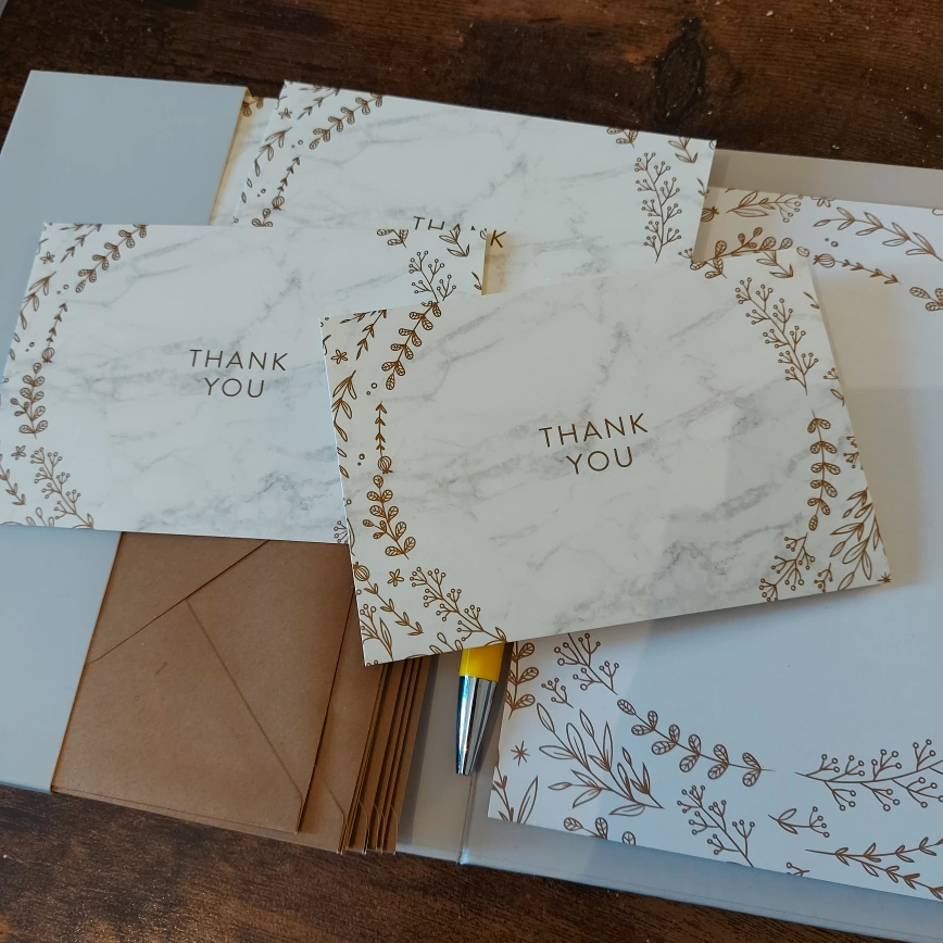 Set includes thank you cards, envelopes, and stationery paper. Comes in a box tied with a ribbon. Was gifted this when I got married but never used it as I had my own cards. Pen is for scale, does not come with the set. Pick up at Pape Station.