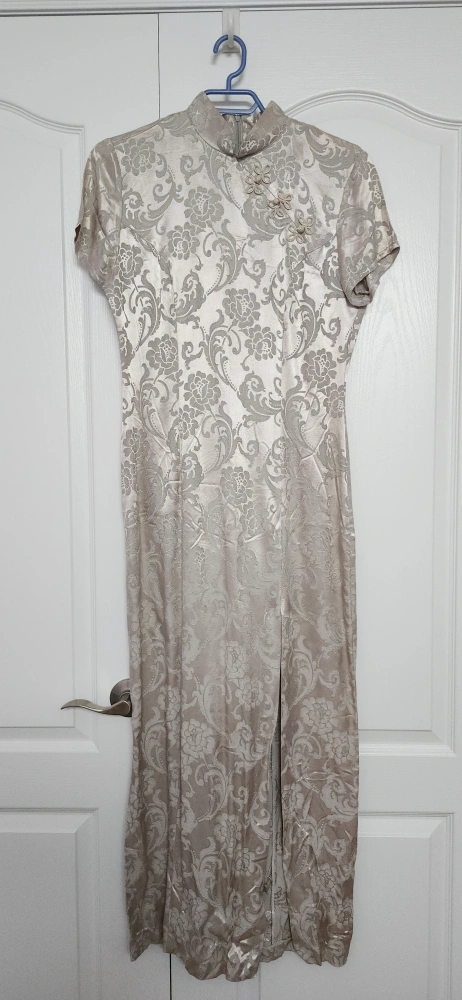 Long, silver dress with a mandarin collar, short sleeves, and a floral pattern. Great for your next special occasion! Can arrange pick up in York Region.