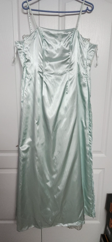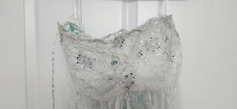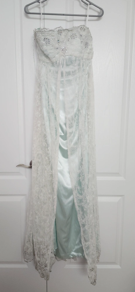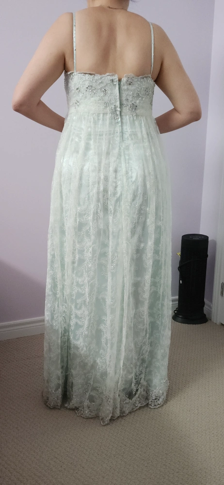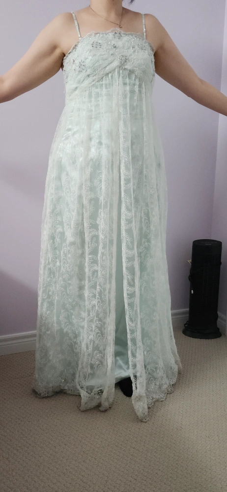 Long, mint green formal dress. Spaghetti strips with a lace overlay and a satin underlayer. Beaded detail around the bodice. This dress was custom made and I was size 12 at 5' 9". I am now size 14 and still fits. Bust is 33 inches with extra material for 4 inches extension in total if needed. Length is 53 inches. Selling as is. Can arrange pick up in York Region.