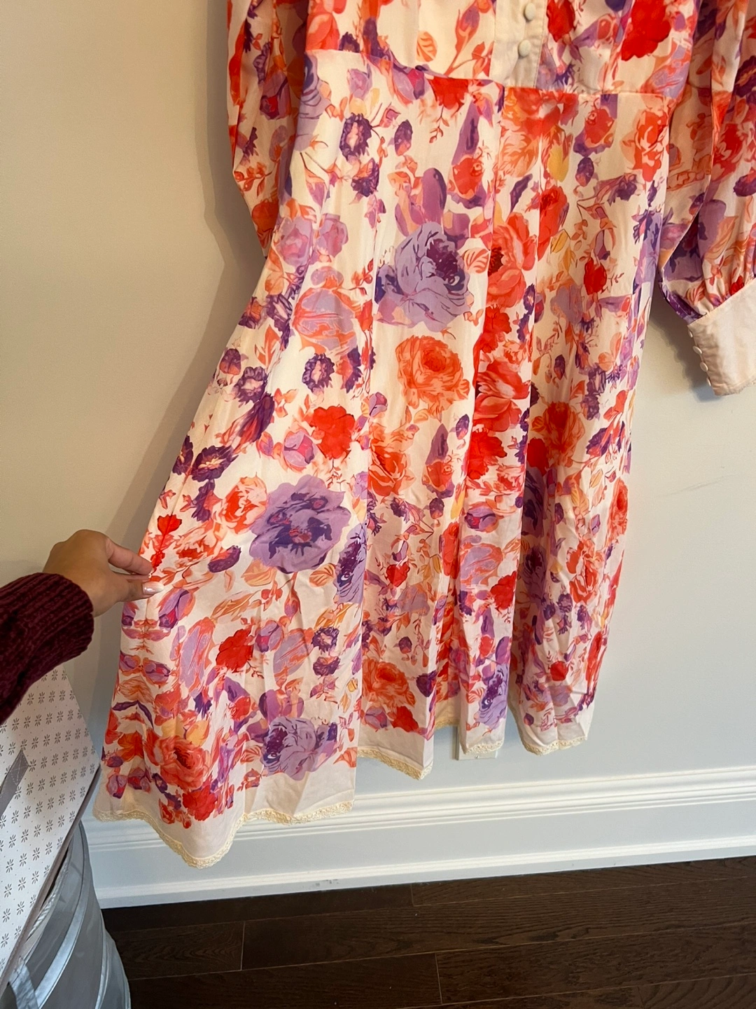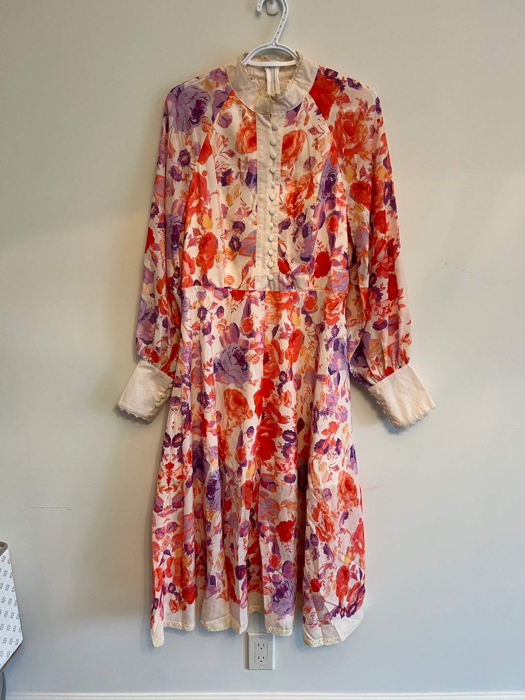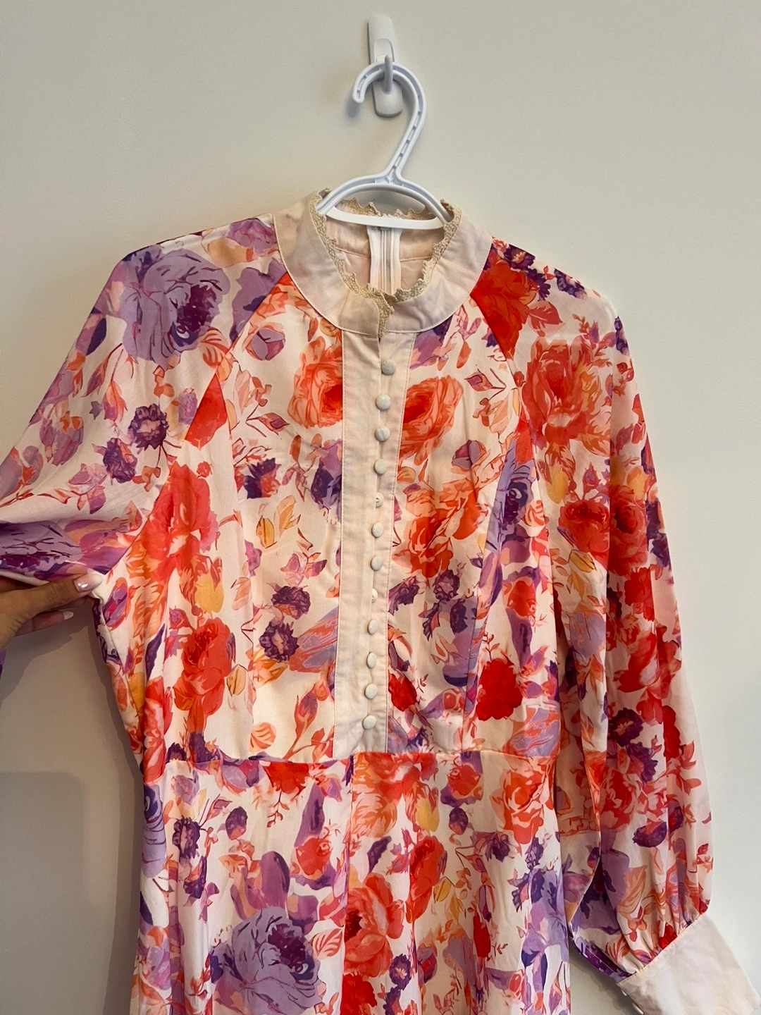 Floral patterned dress with long sleeves, button up front, and a belt. White background. Zimmerman look alike dress size medium No pockets 100% polyester Ptp: 20.5 Waist: 16.5 Lenght: 49