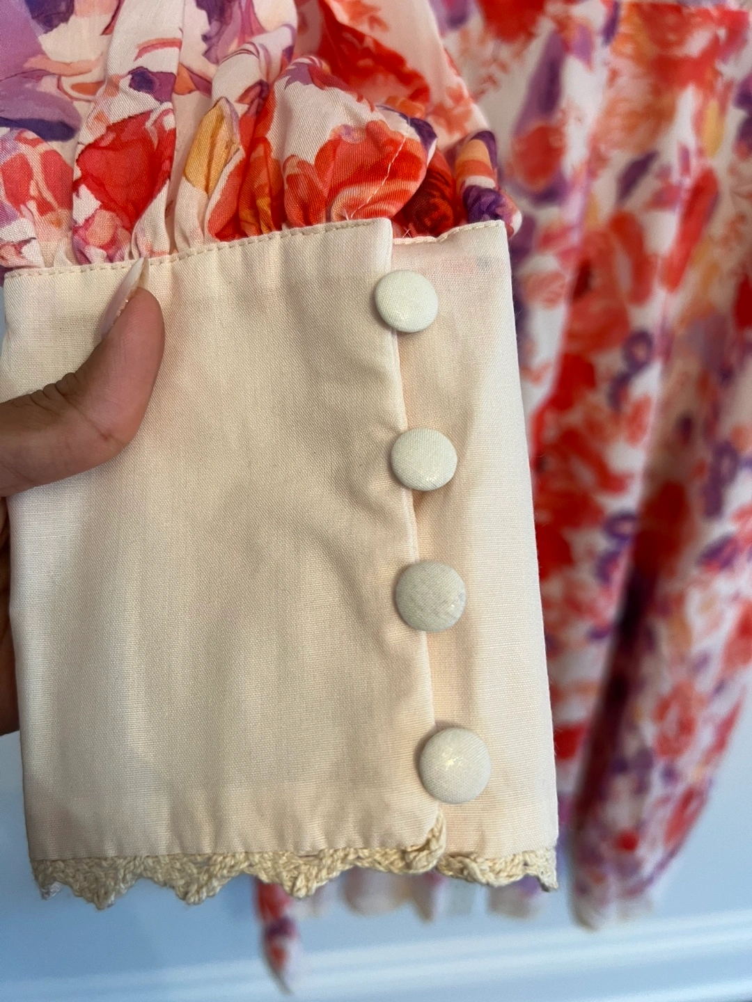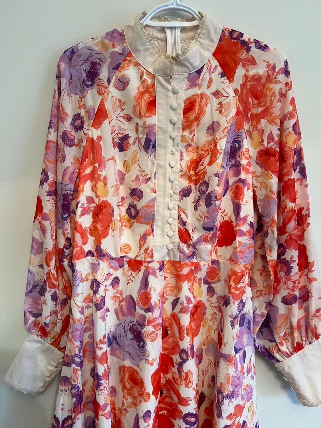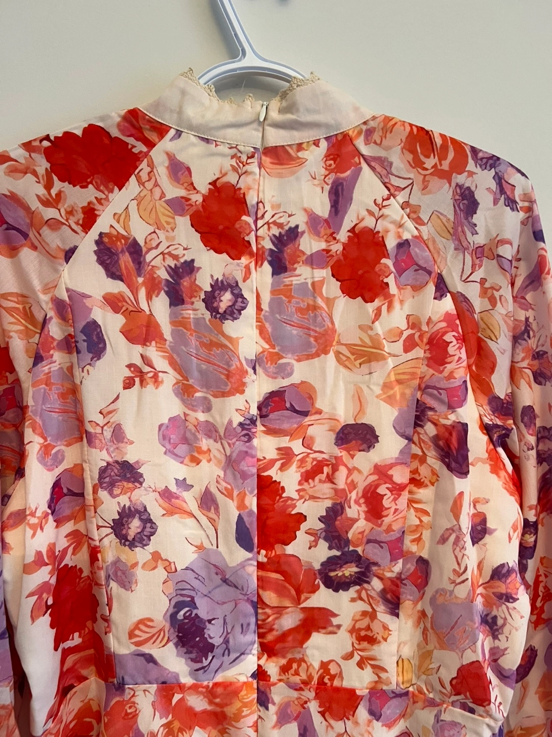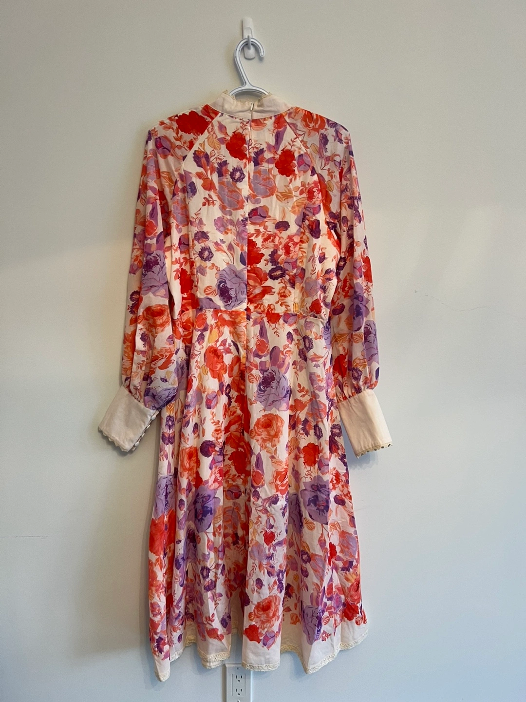 Floral patterned dress with long sleeves, button up front, and a belt. White background. Zimmerman look alike dress size medium No pockets 100% polyester Ptp: 20.5 Waist: 16.5 Lenght: 49