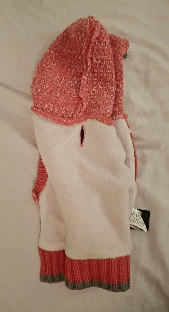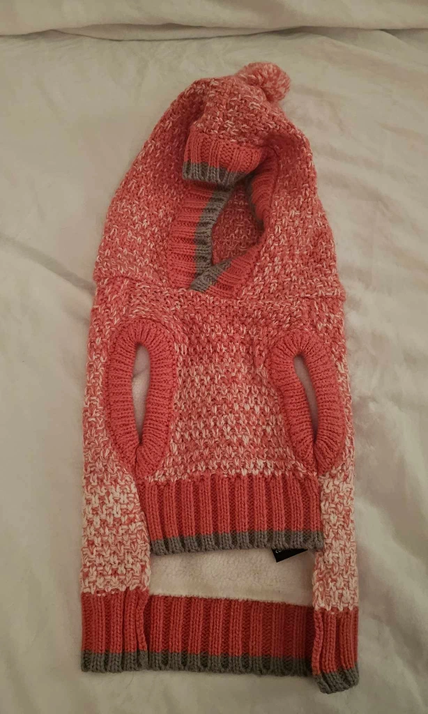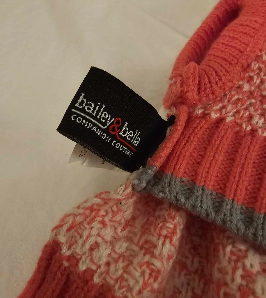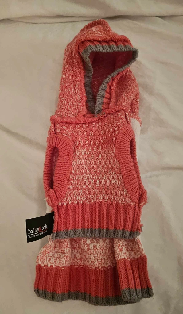 This Pink, White and Grey Bailey & Bella Dog Sweater is Brand New and never worn. No Tags attached. Size XXS Shell: 100% Acrylic Lining: 100% Polyester Measurements: Length: 16 inches. Width: 6 1/2 inches. From a smoke free home. Cash and E-Transfer accepted. Pick up only.