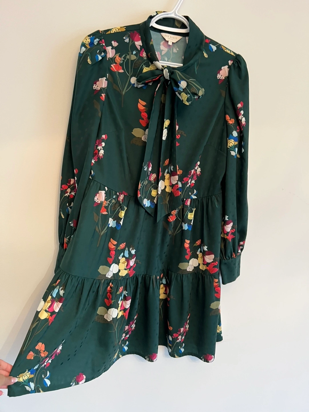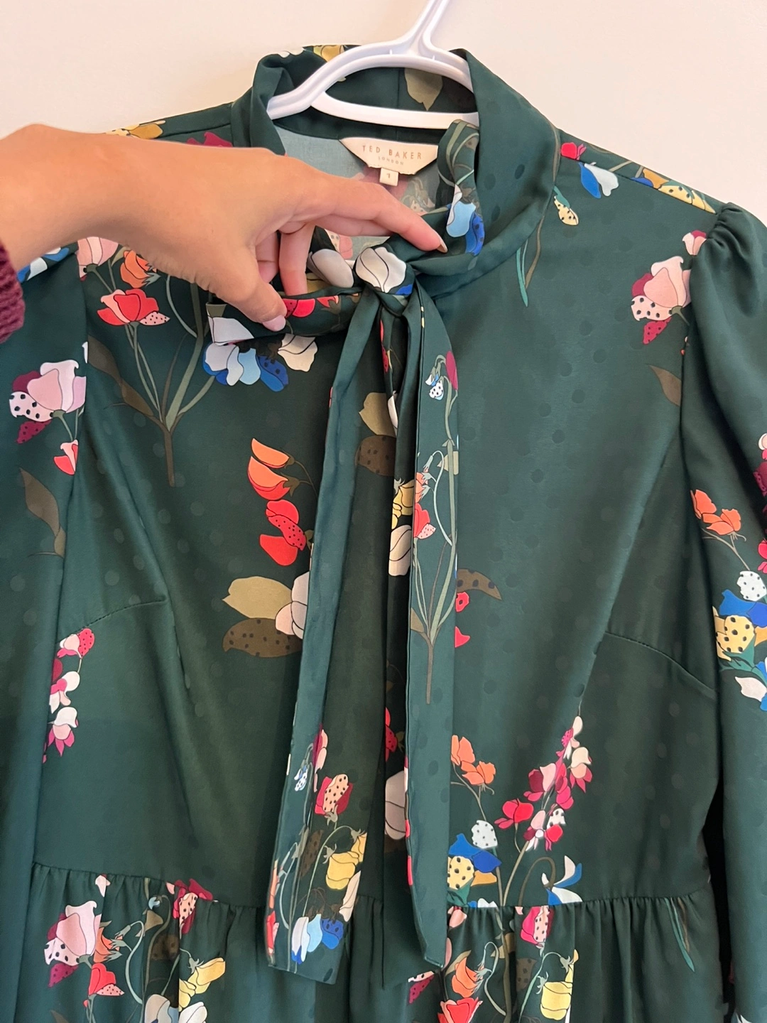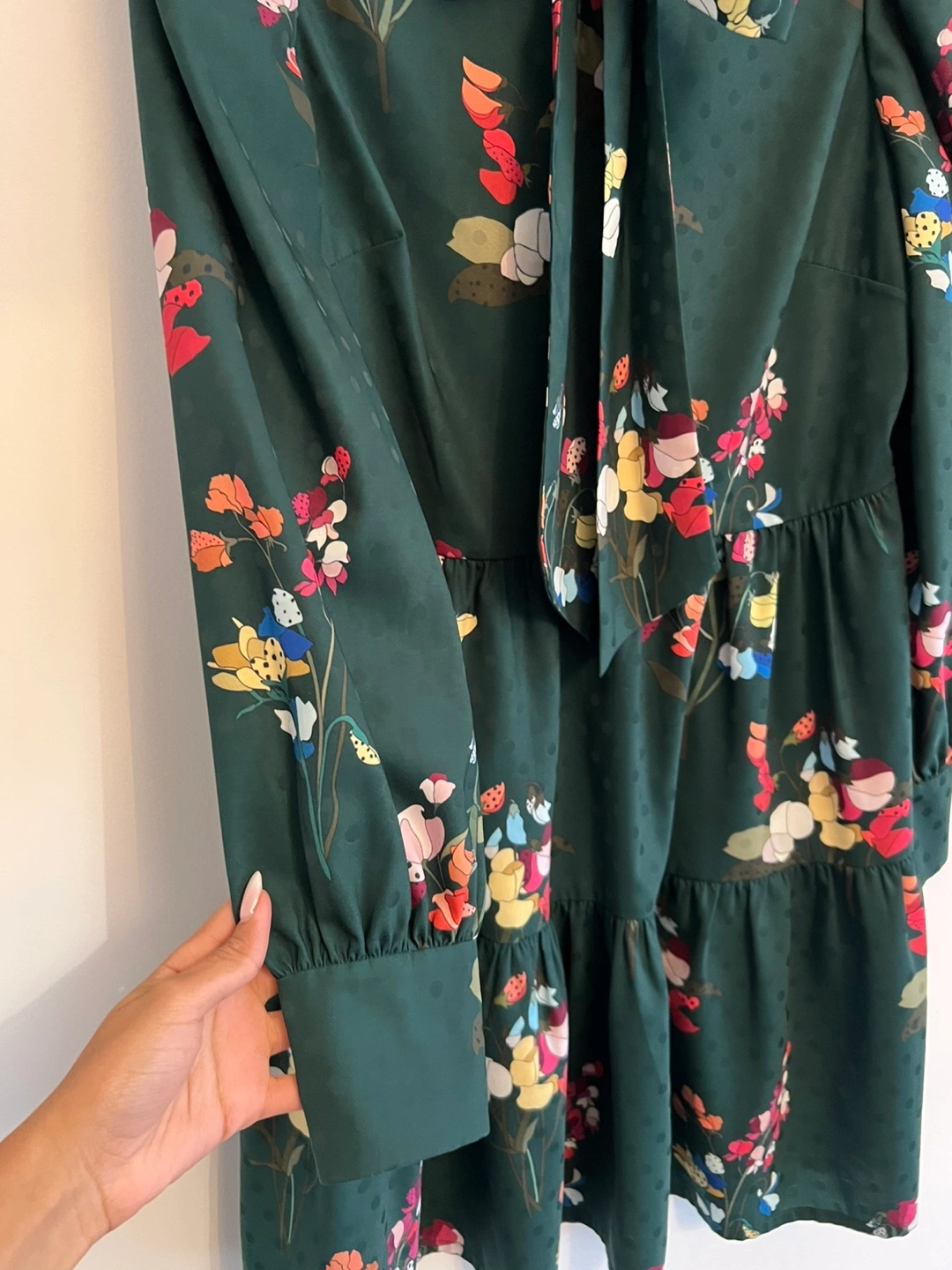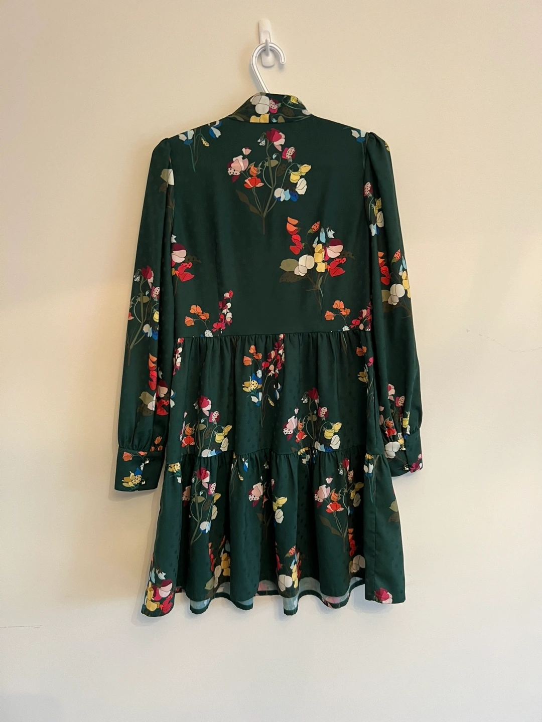 Green floral dress with a bow tie at the neck. Long sleeves with button cuffs. Tiered skirt. Size 1. It’s oversized dress can fit small medium