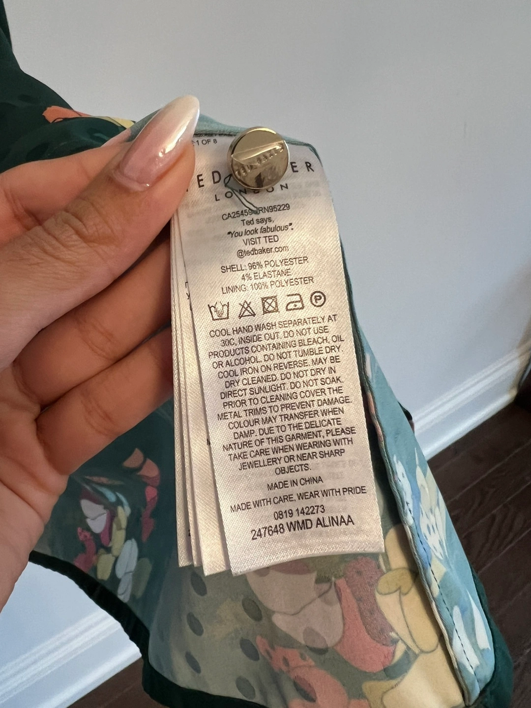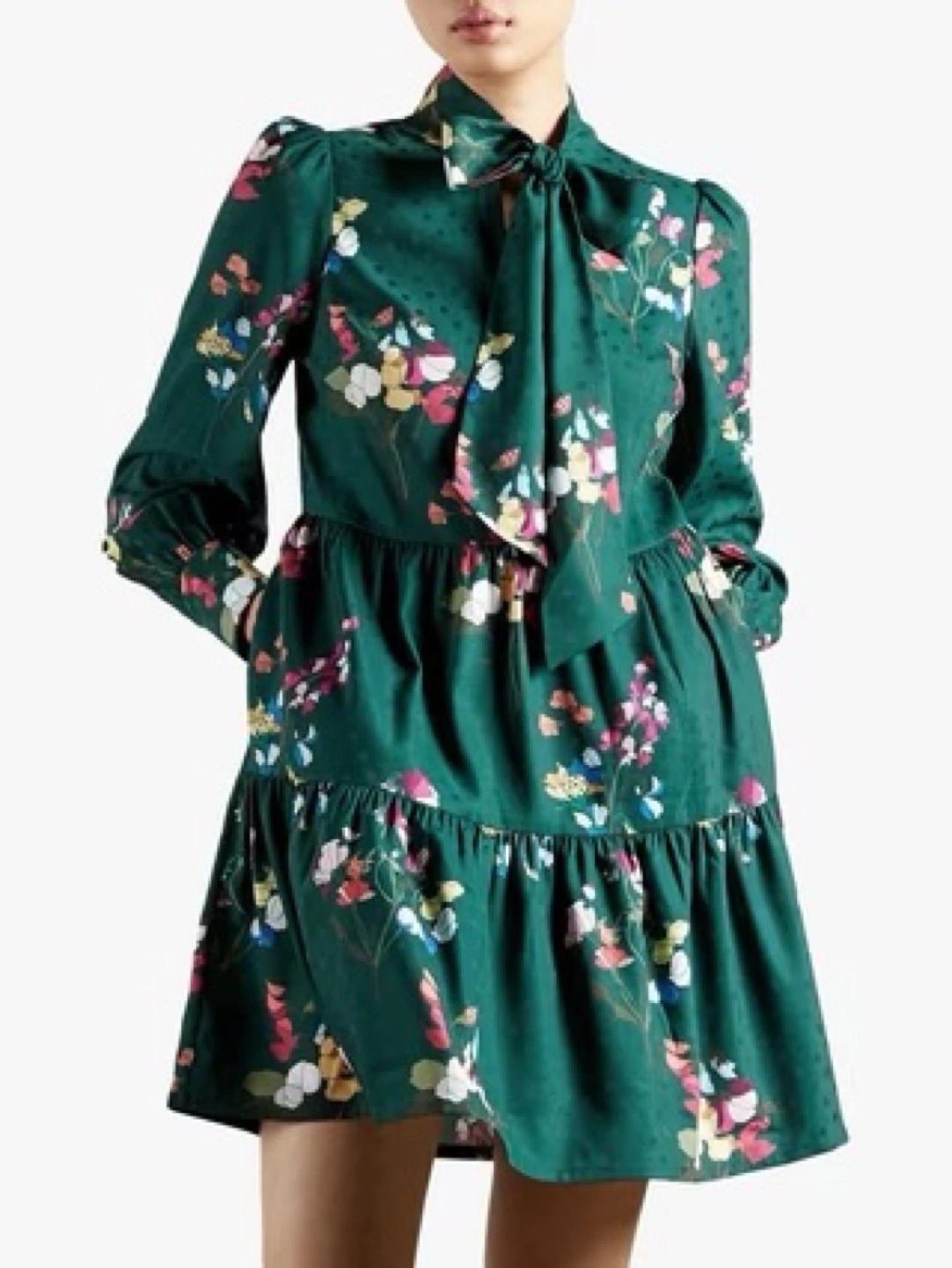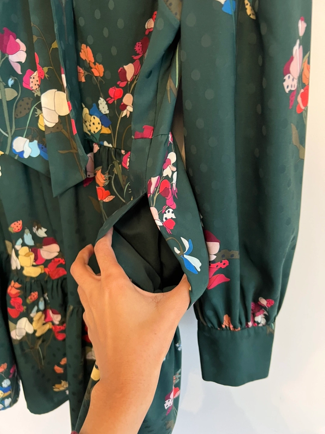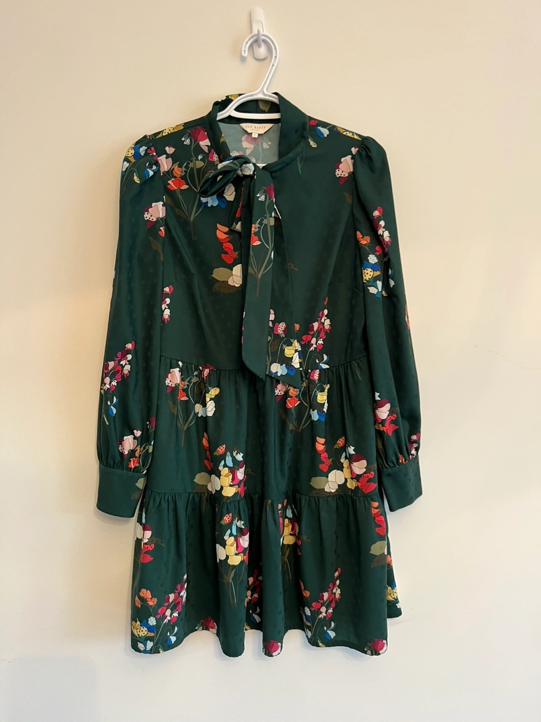 Green floral dress with a bow tie at the neck. Long sleeves with button cuffs. Tiered skirt. Size 1. It’s oversized dress can fit small medium