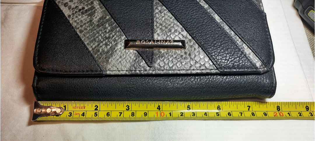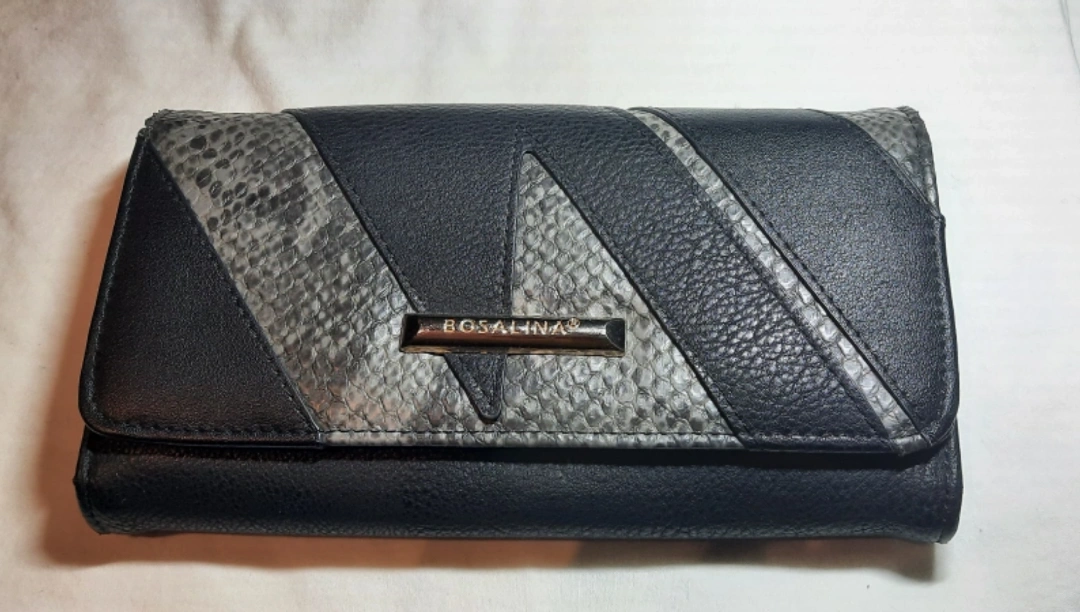 Black and grey snake skin wallet with gold accents. Has multiple card slots and a zippered coin pouch. In good condition, leatherette.