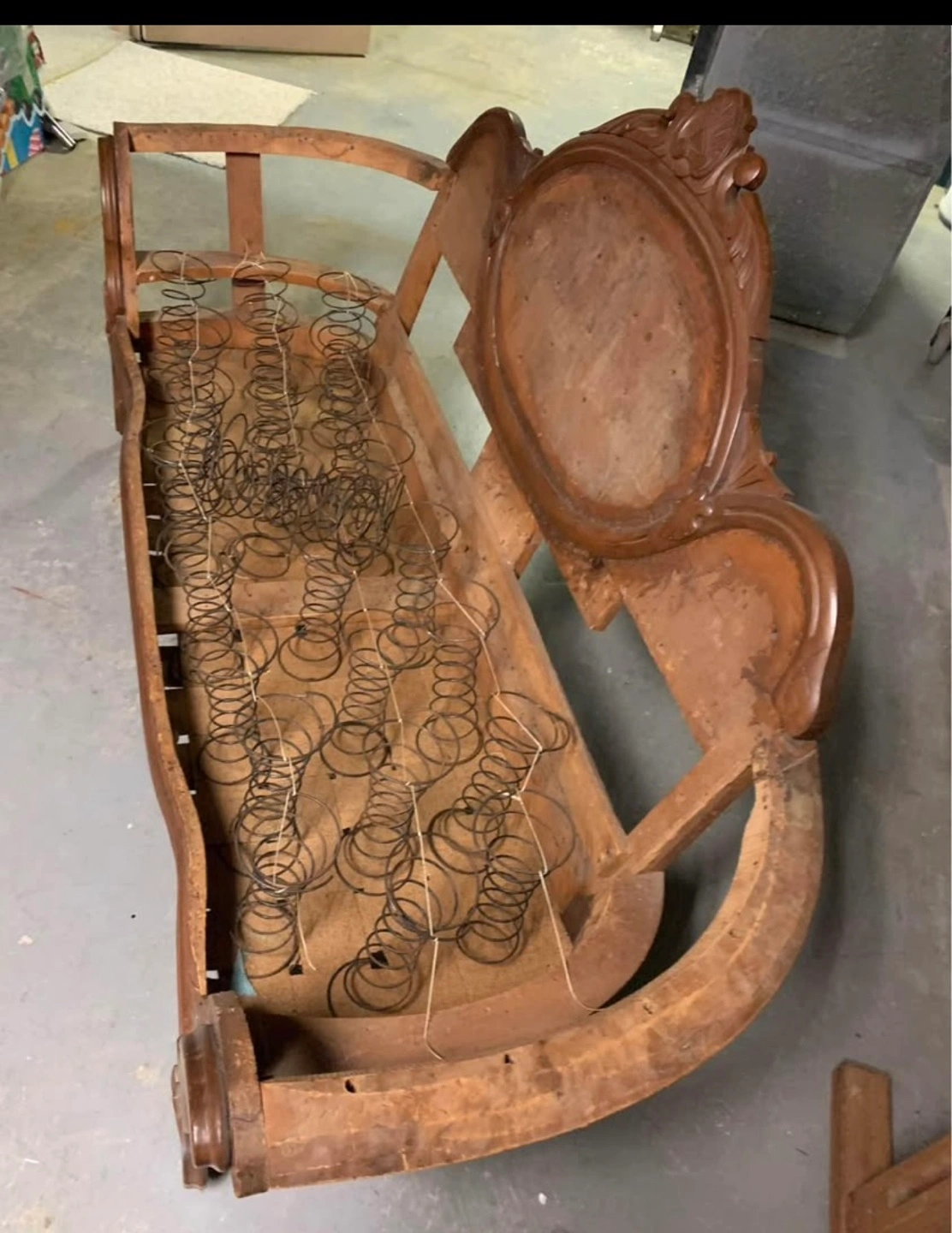 $180 antique walnut sofa frame (3 seater) over 80 yrs old. Newly refinished with original brass wheels includes webbing with springs 71 x 30 Pick up Birchmount and Sheppard * buyer will need to get it upholstered *fabric in last pic not included
