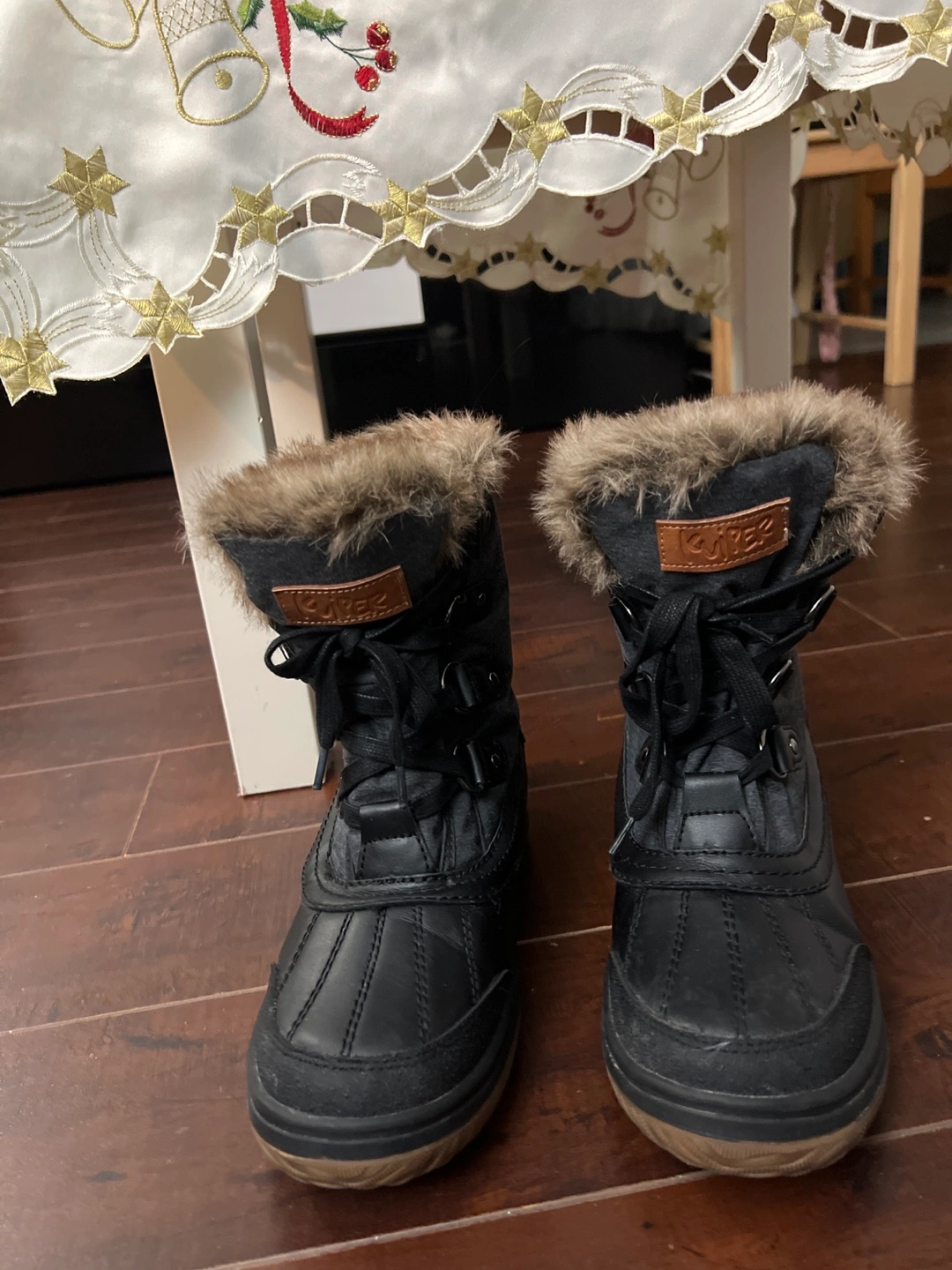 Black winter boots with fur lining and waterproof exterior. Lace-up closure. Fit to 7 pick up 4140 Bathurst st