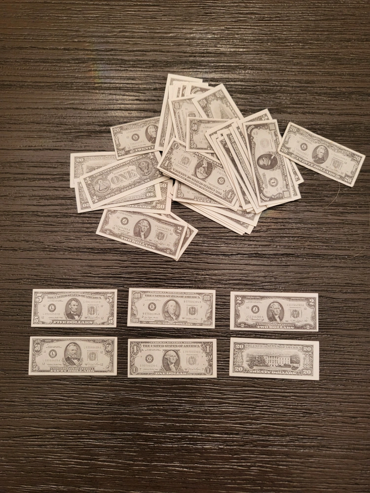 Miniature US Bills. Great for dollhouses or coin/stamp enthusiasts. One photo has a dime for reference. $15 obo.