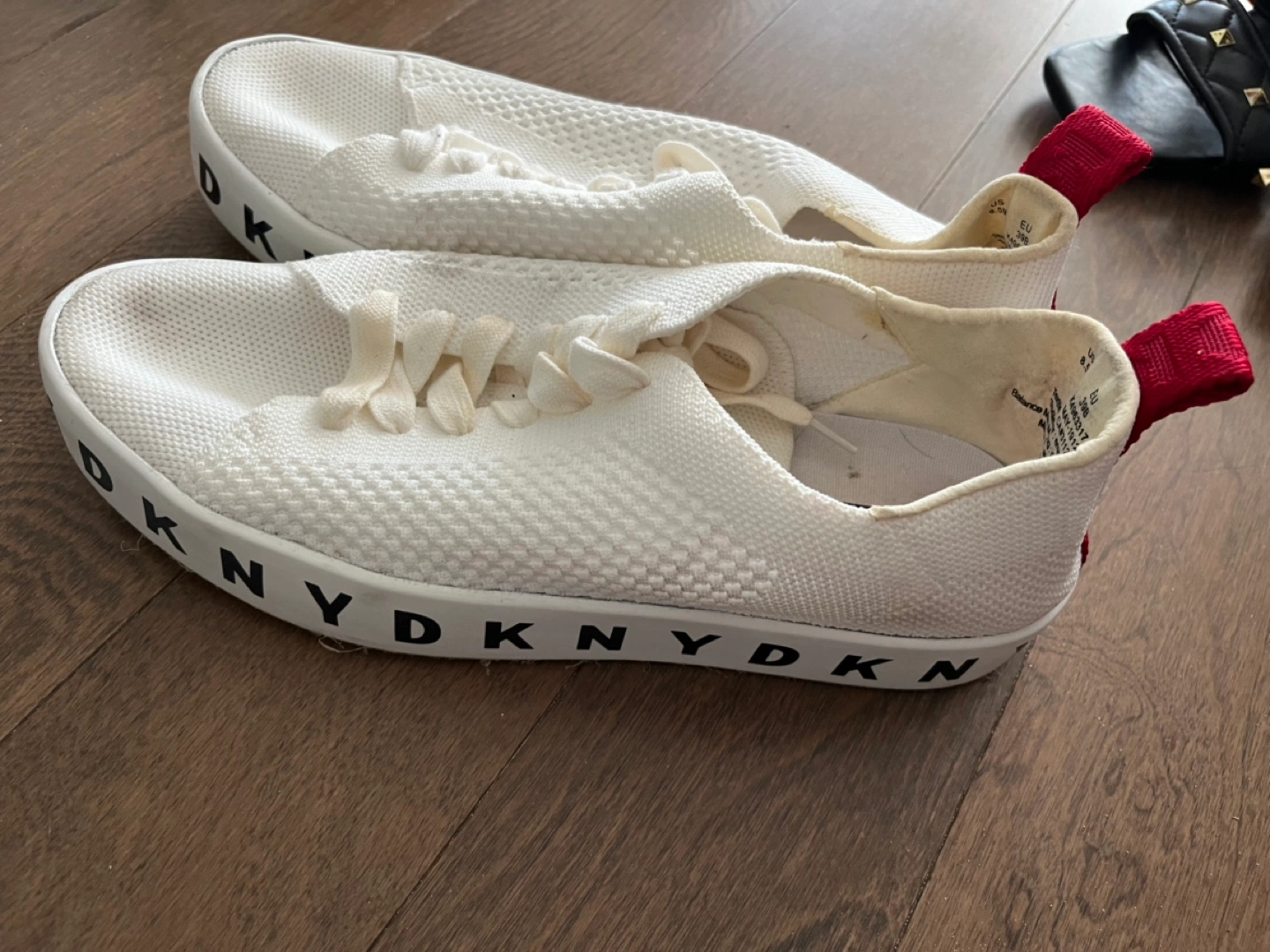 White knit sneakers with red accents, lace-up closure, and DKNY branding.