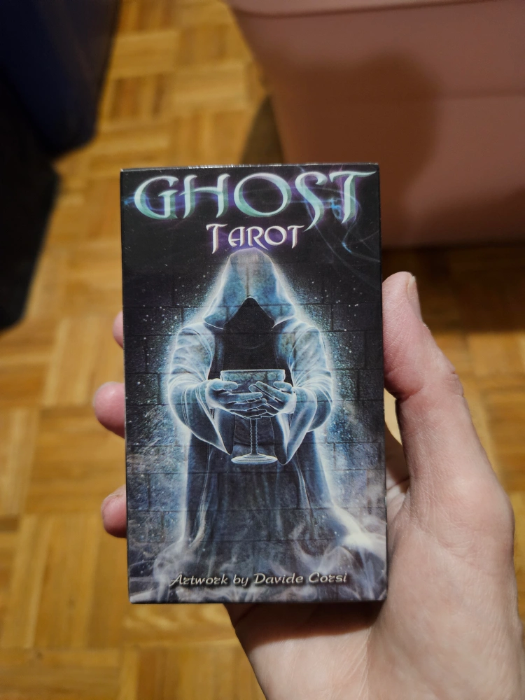 Tarot deck featuring a ghostly figure on the box. Artwork by Davide Cotsi.