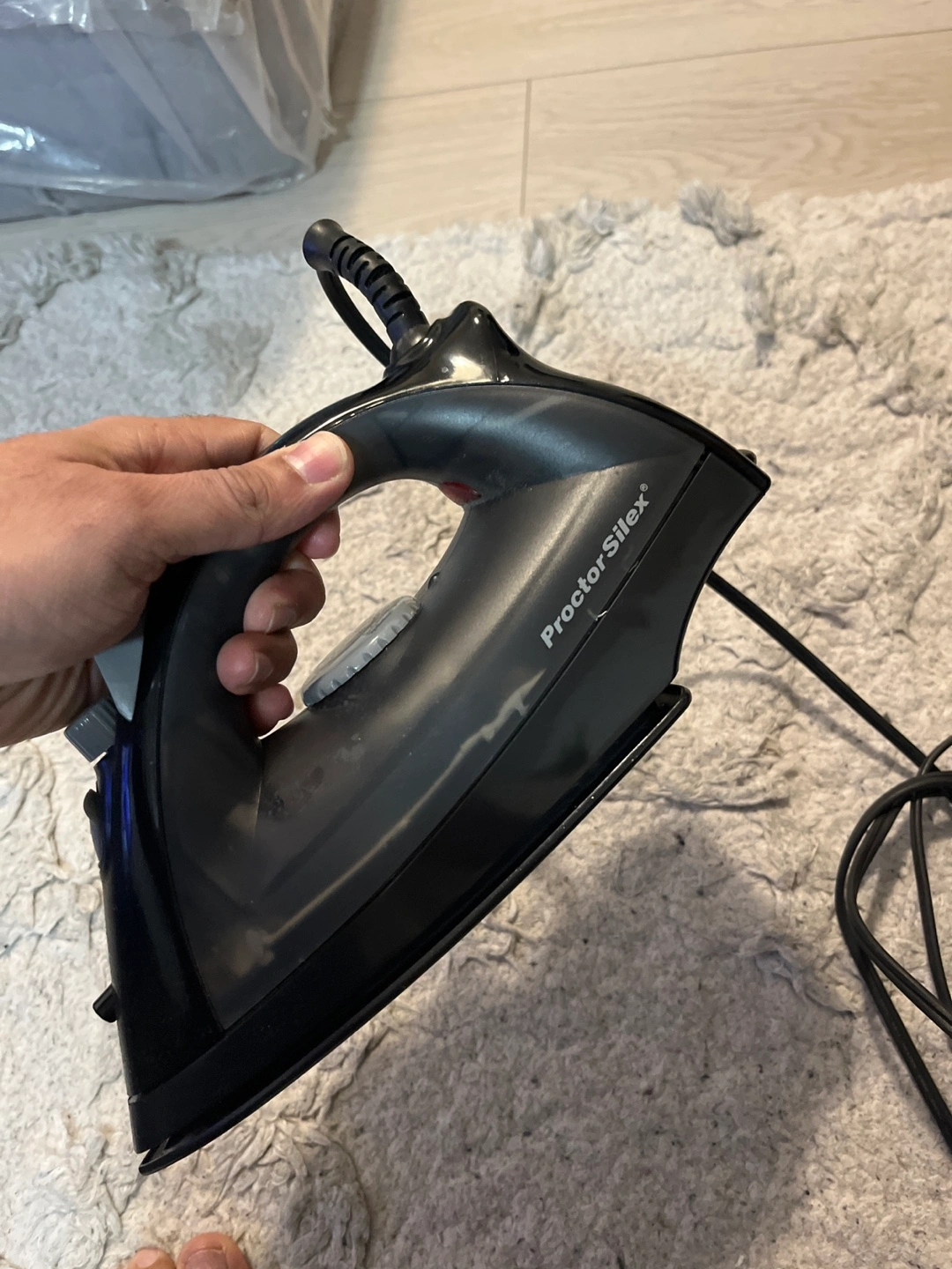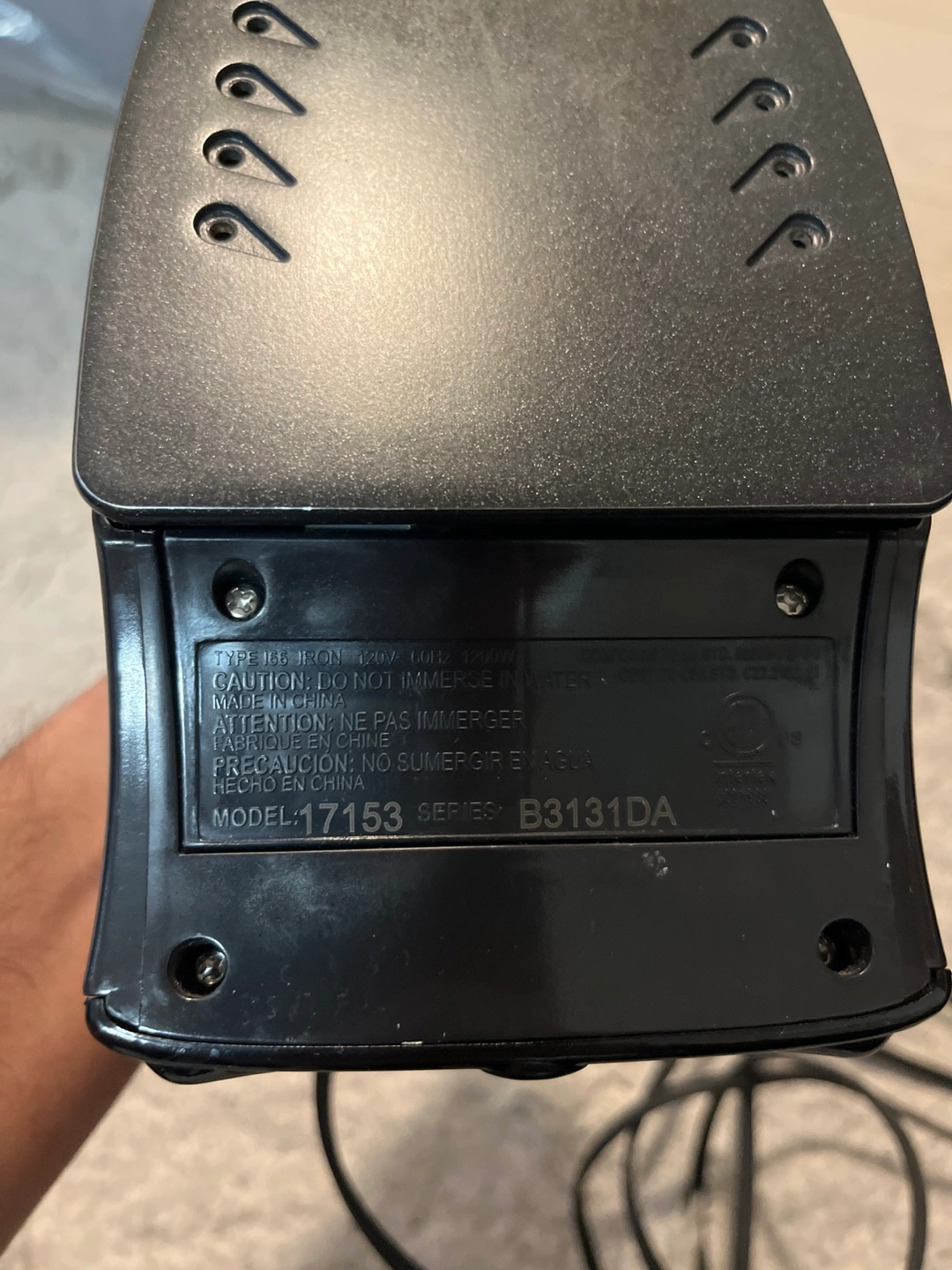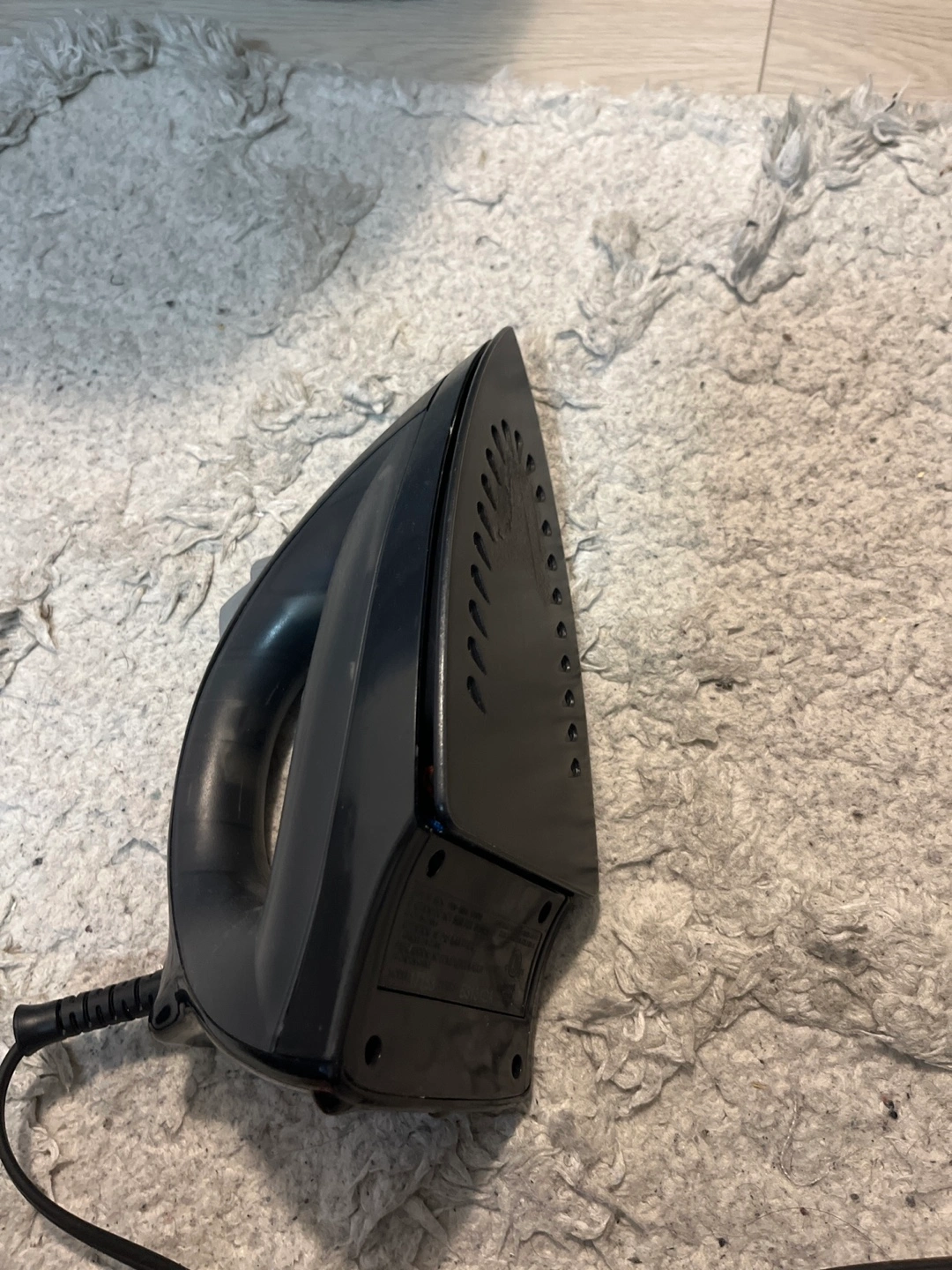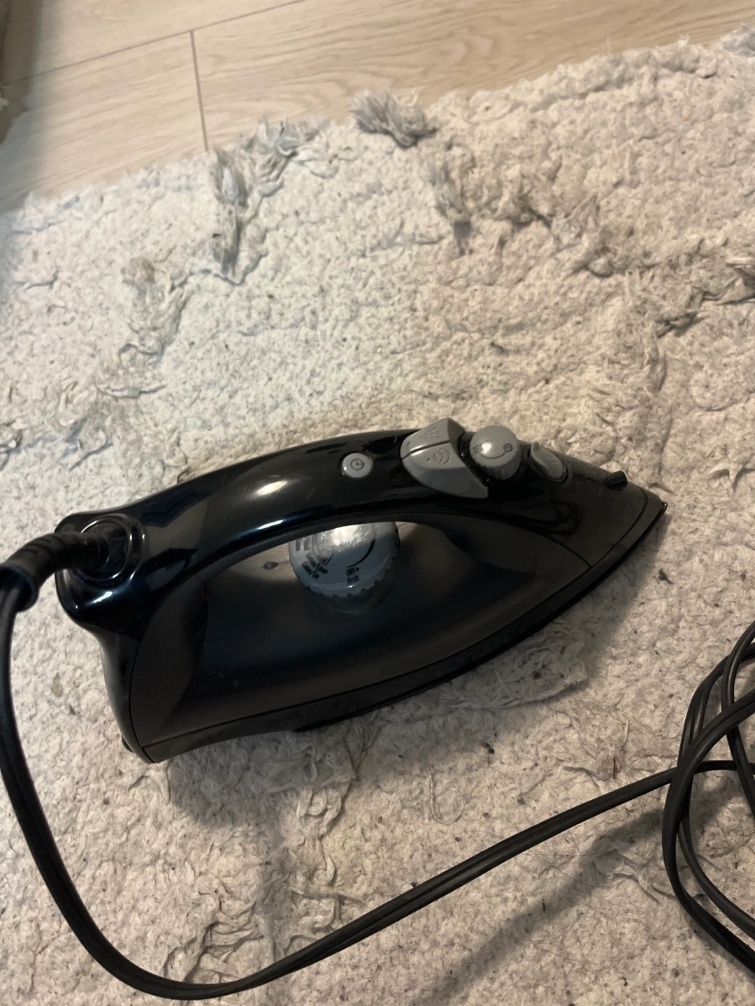 Black iron with a dial and buttons. Cord included.