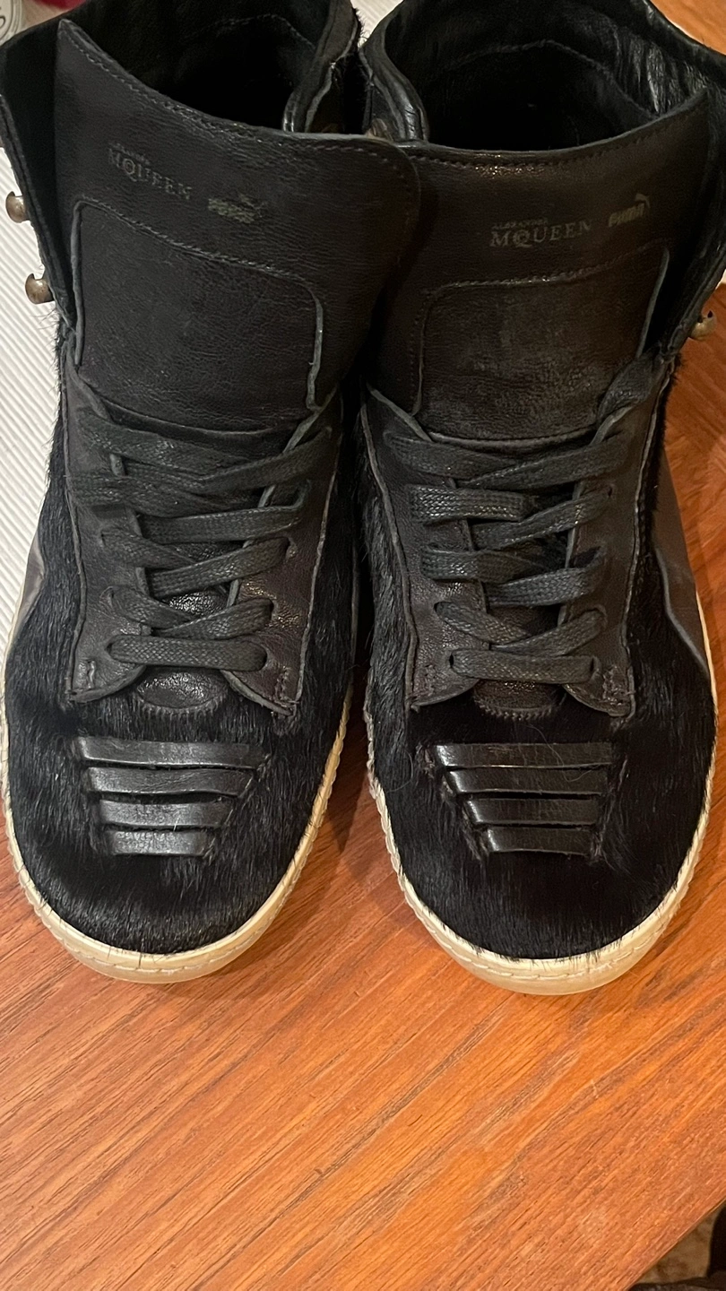 Alexander McQueen X Puma, black leather and fur high top sneakers. Gold accents. White soles. Lace up. EURO SIZE 40 US SIZE 9