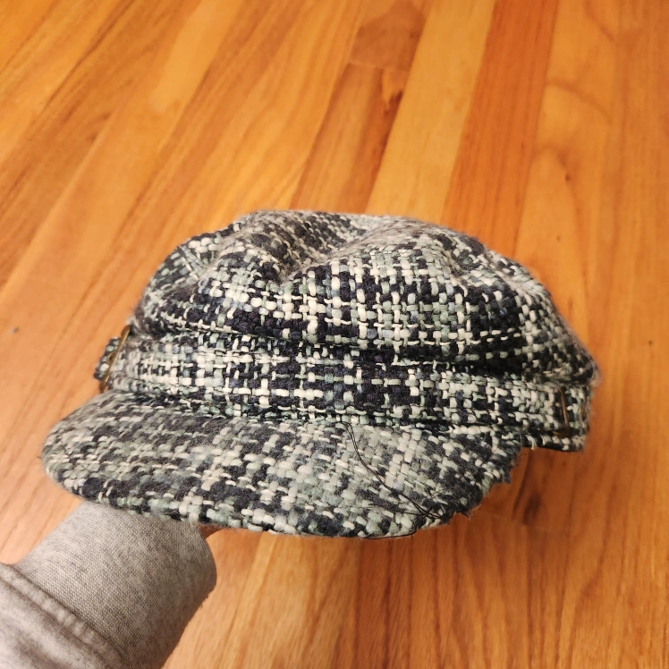 Blue and green tweed newsboy hat with a buckle. The hat is in good condition, with some minor wear and pills.
