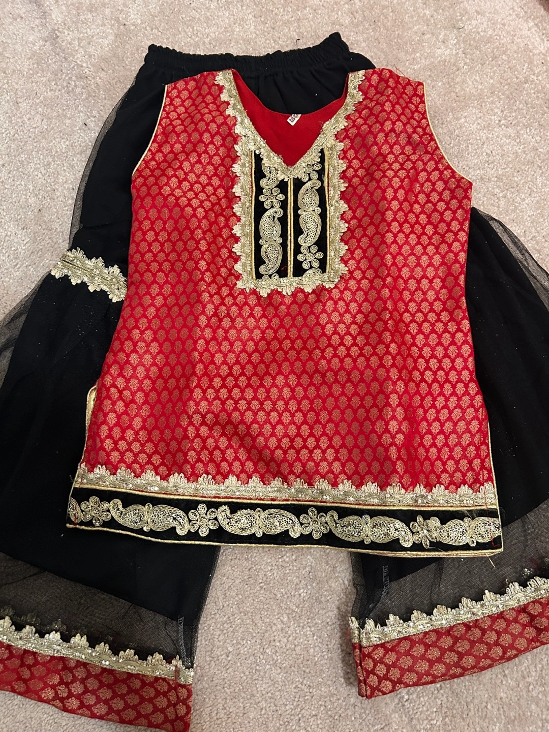 Red and black sharara with gold embroidery. Includes a dupatta. Size 3-5 years old