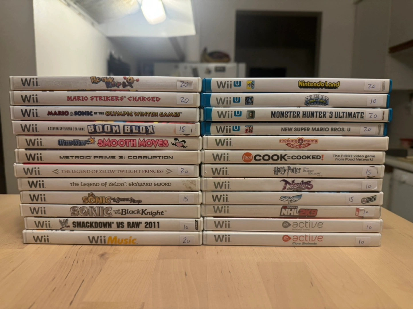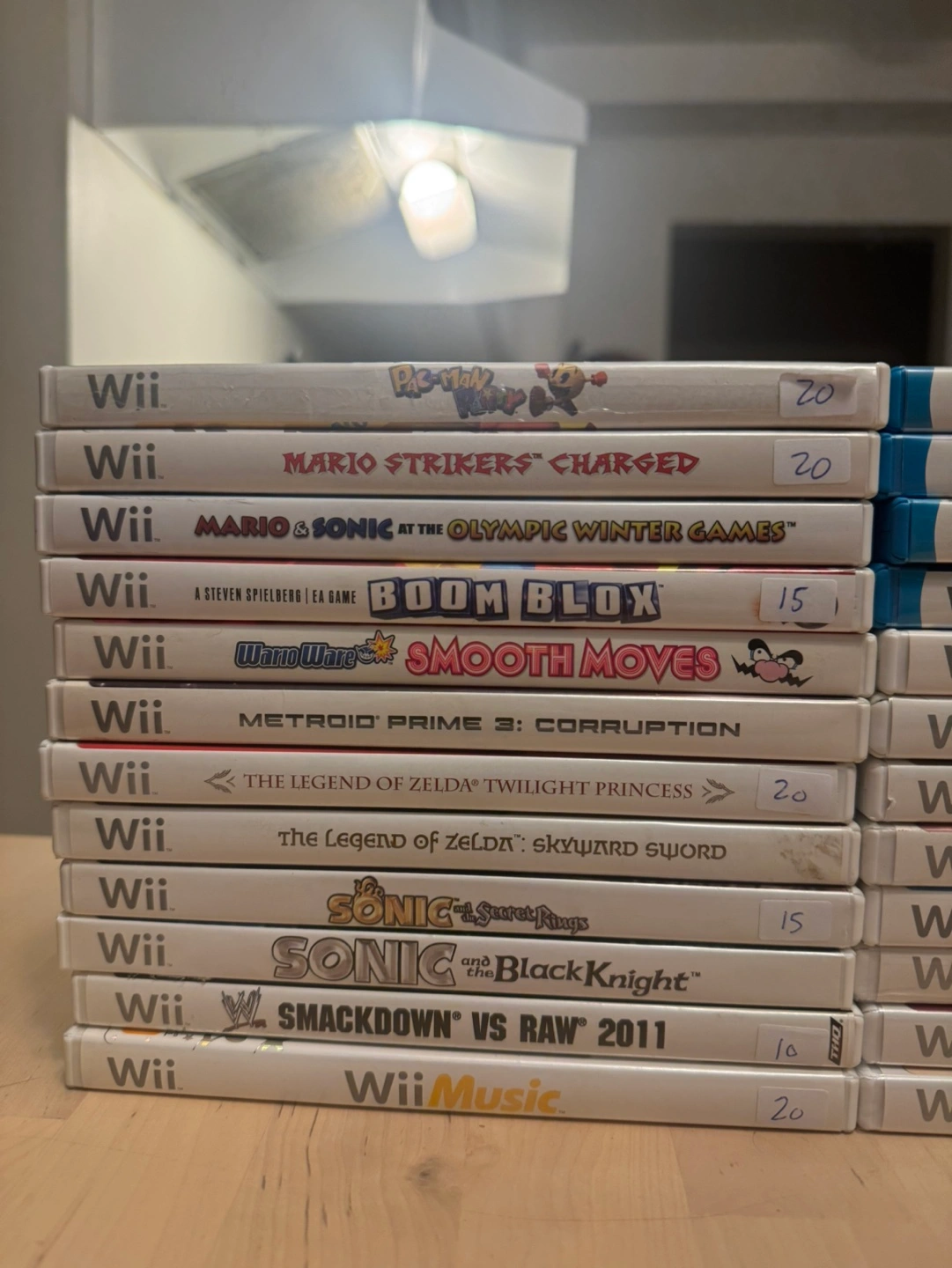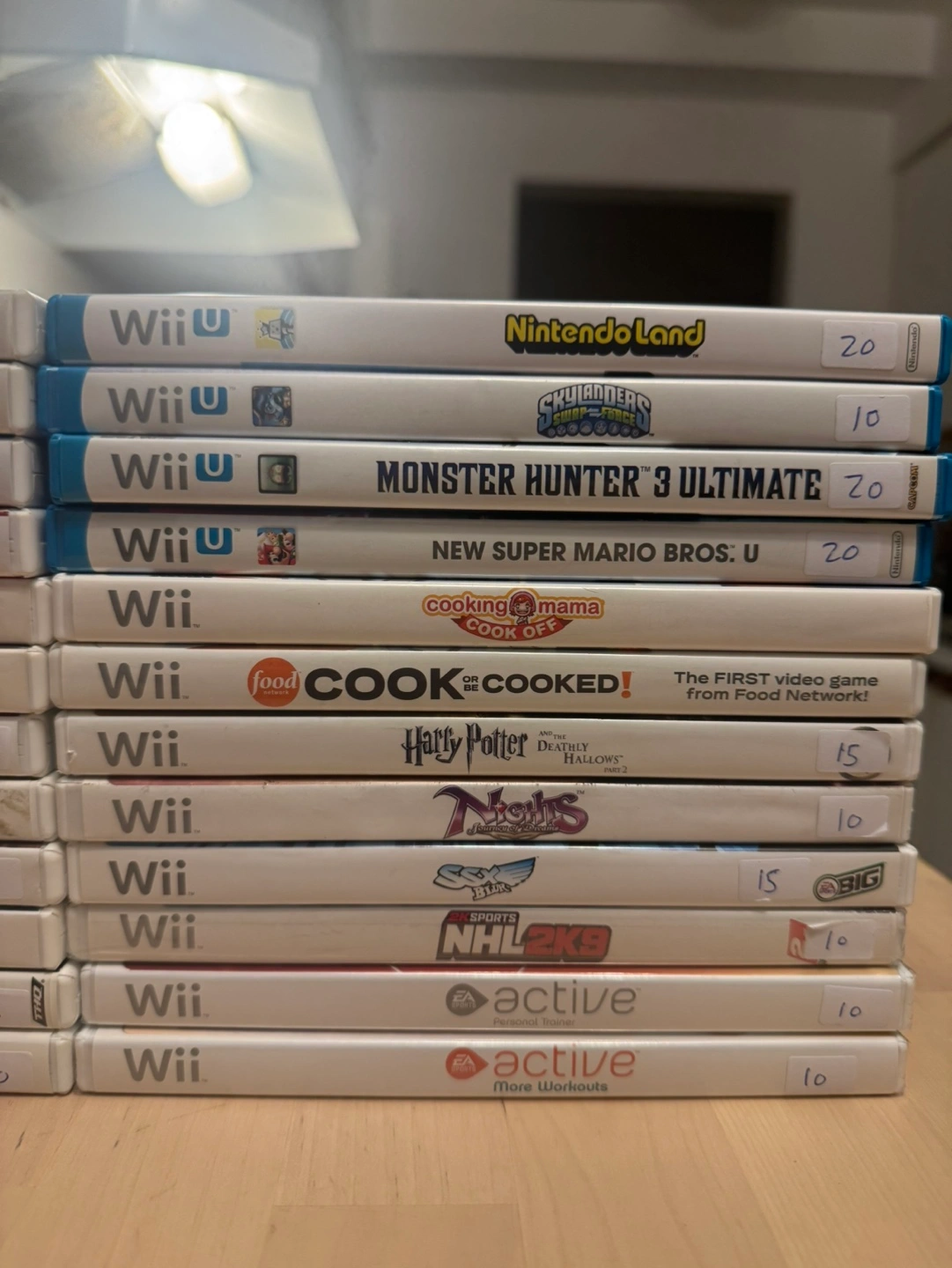 Selling off all our old Wii Game Collection Pac-Man Party - $20 Mario Strikers Charged - $25 Mario And Sonic at The Vancouver 2010 Olympics - $30 Boom Blox - $15 Wario Ware Smooth Moves - $30 Metroid Prime 3 Corruption - $20 The Legend Of Zeld Twilight Princess (SOLD) The legend of Zelda Skyward Sword - $30 Sonic & The Secret Rings - (SOLD) Sonic & The Black Knight - (SOLD) Smack down Vs Raw 2011 - $10 Wii Music - $15 EA Active Games $5 NHL 2k9 (sealed) $10 SSX Blur - $15 Nights Journey In Dreams $20 Harry Potter and the deathly hallows 2 - $10 Cooked or be cooked food network - $10 Cooking mama cook off - $20 New super Mario bros Wii u - $20 Monster hunter ultimate 3 - $20 Skylanders swap force - (SOLD) Nintendo land $20