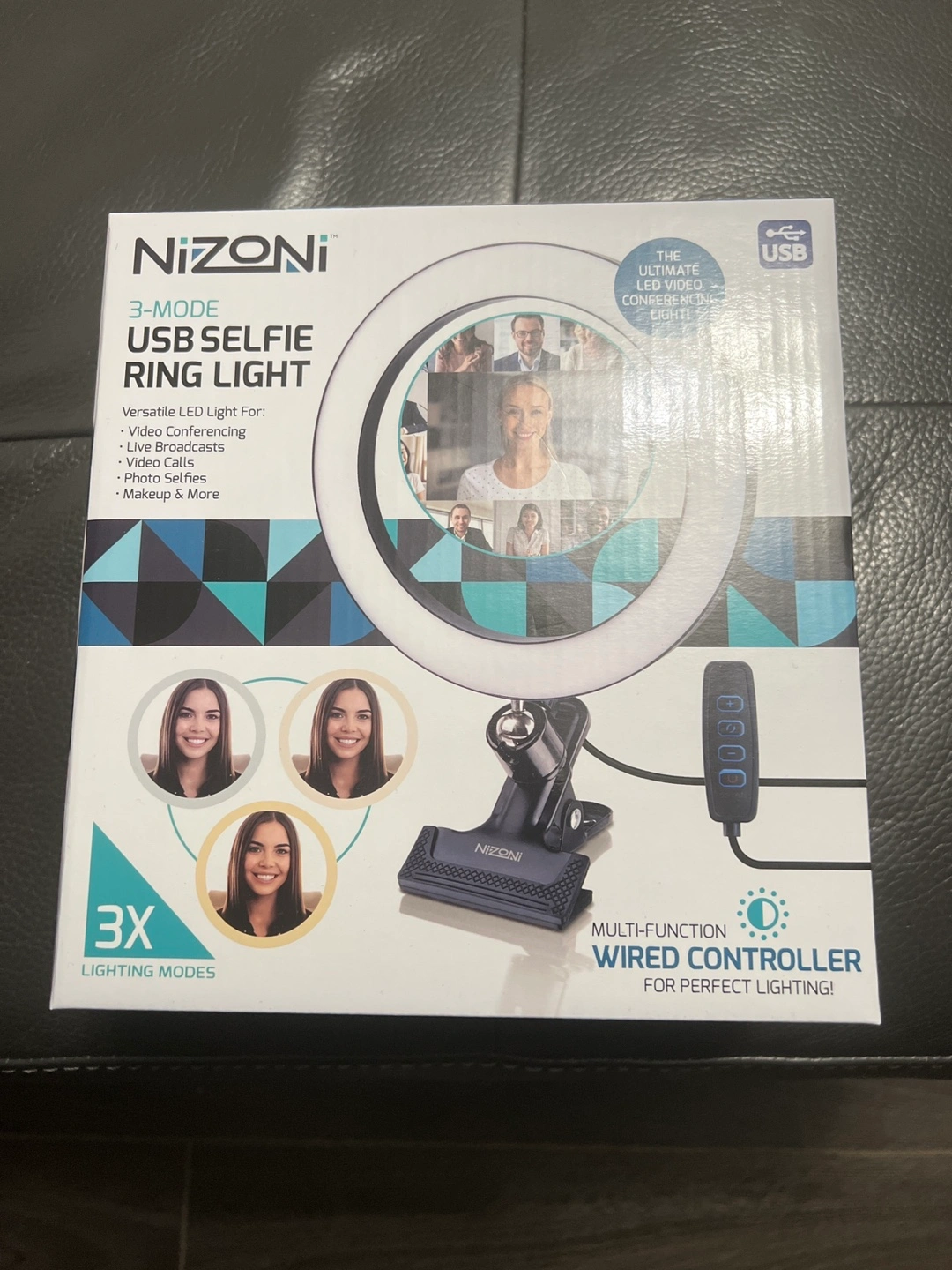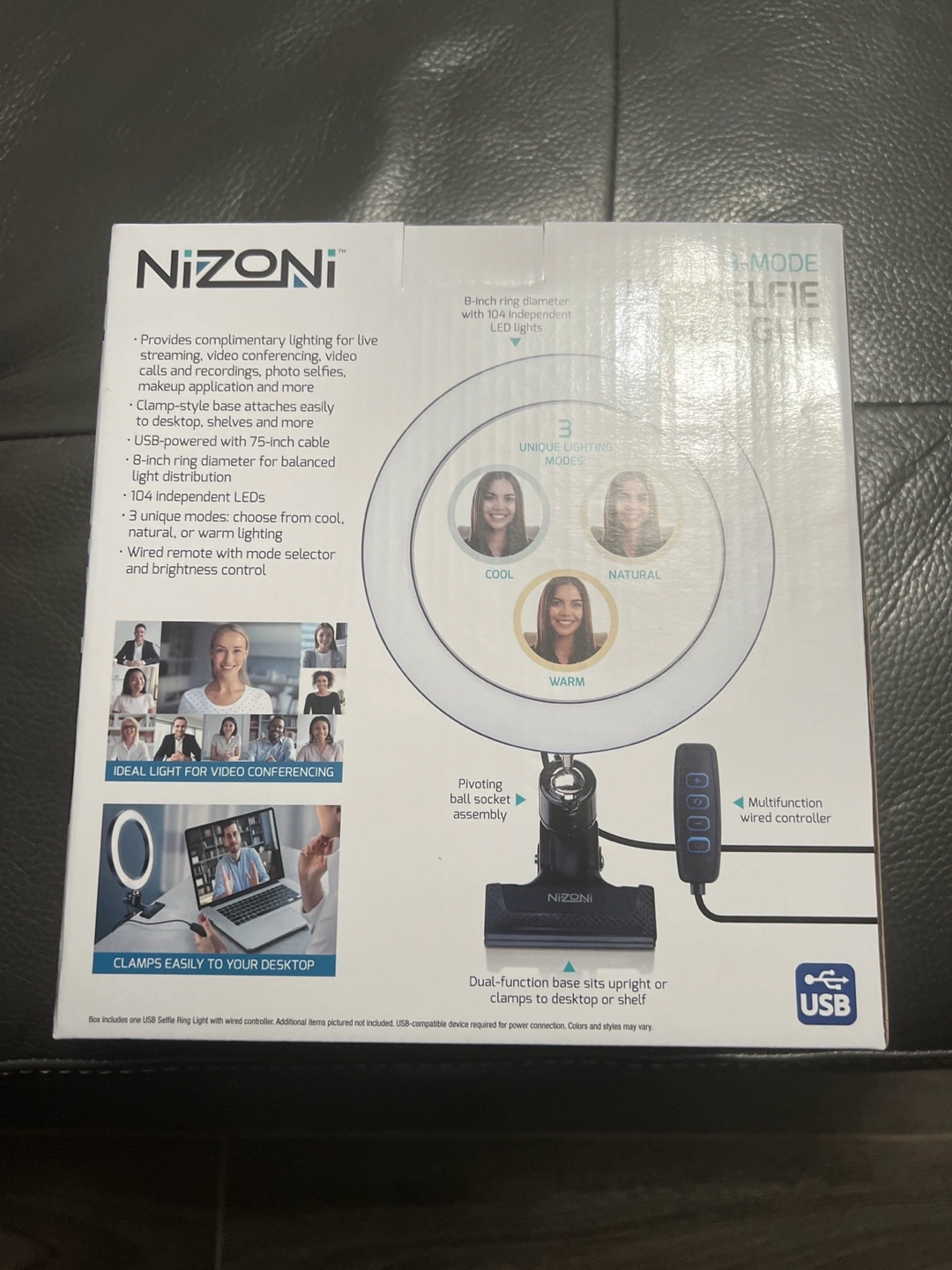 Versatile LED light for live streaming, video conferencing, video calls, photography, makeup application and more. Clamp-style base attaches easily to laptops, desks, and more. USB-powered with 75-inch cable. 8-inch ring diameter for balanced illumination. 104 independent LEDs. 3 unique modes: choosing from cool, natural, or warm light. Wired controller selector and brightness control.