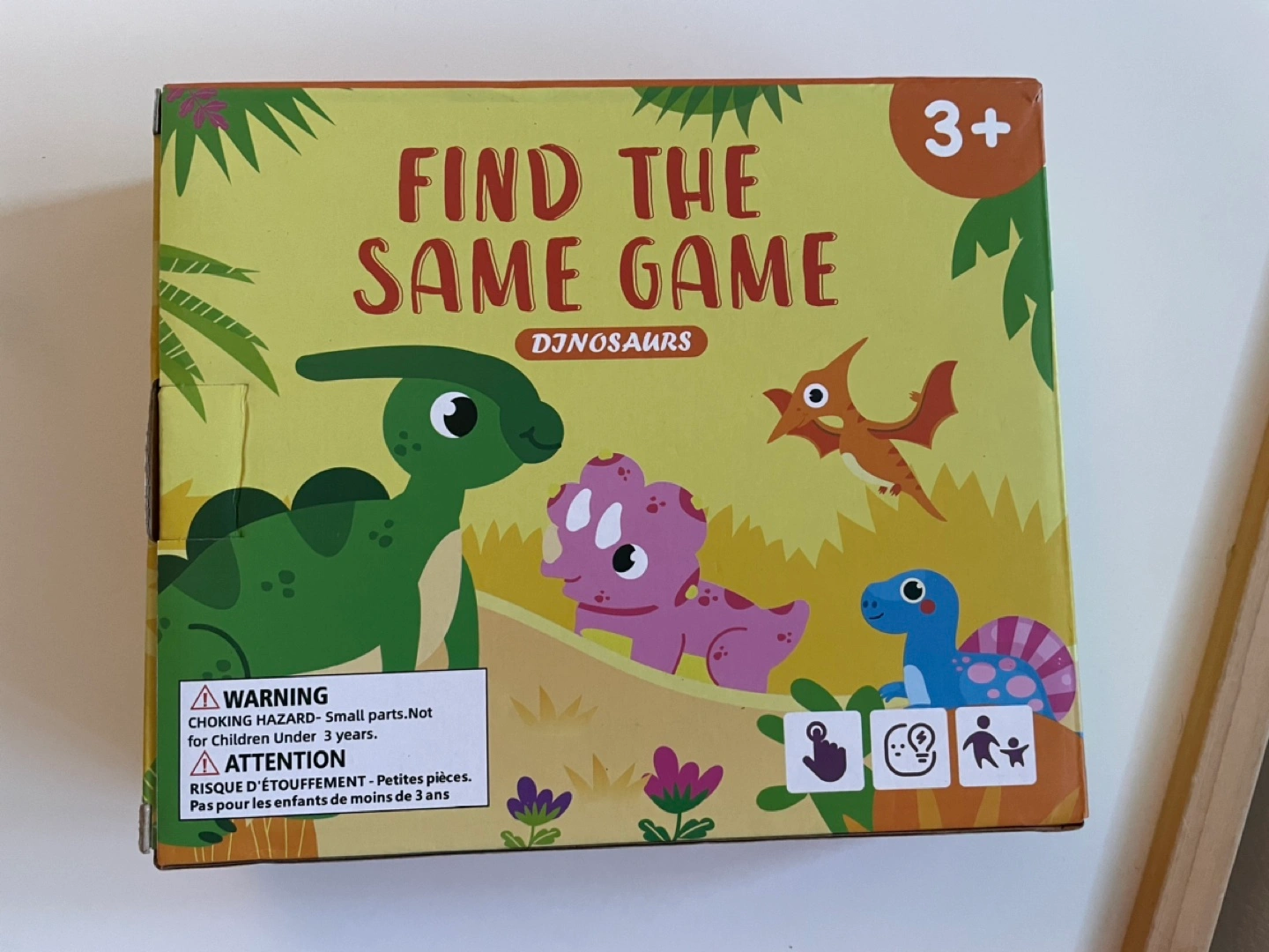 Matching game for kids aged 3 and up. Great for dinosaur fans, helping with hand eye coordination and memory. Solid wooden pieces with smooth surface. Never used. Brand new in box! https://www.amazon.de/-/en/Dinosaur-Matching-Educational-Children-Learning/dp/B0C2GWPGBM