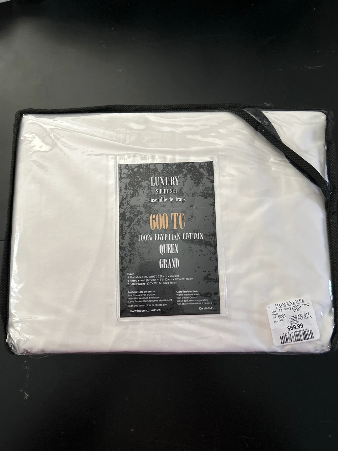 Queen Grand size sheet set. 600 thread count, 100% Egyptian cotton. Includes flat sheet, fitted sheet, and two pillowcases.WHITE