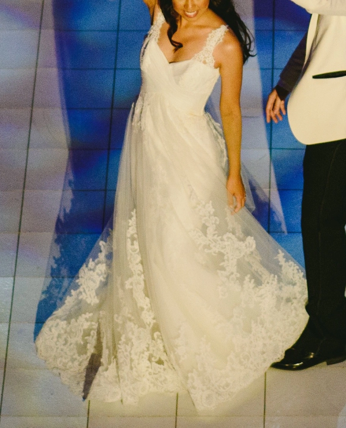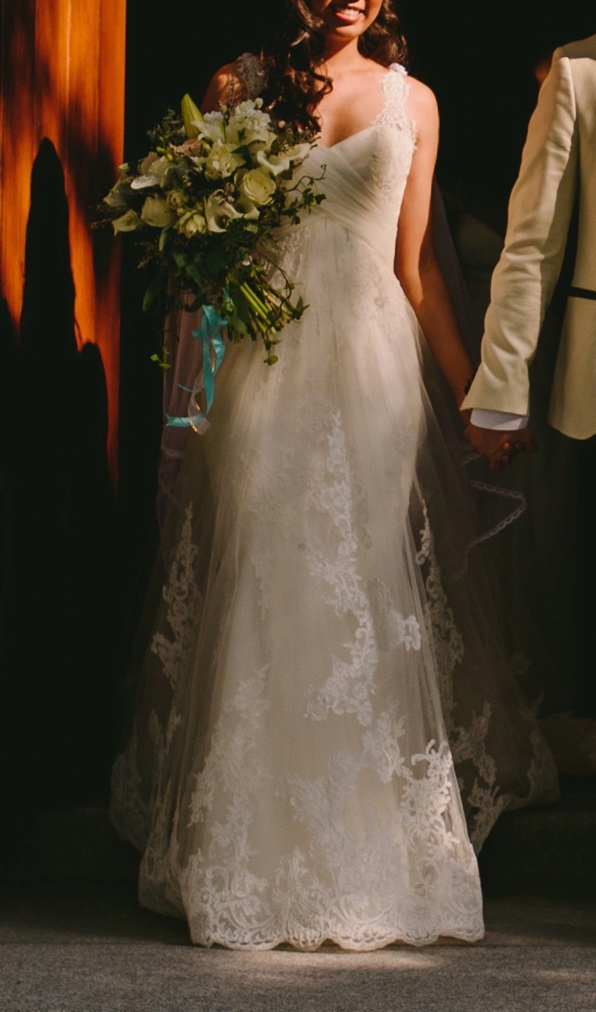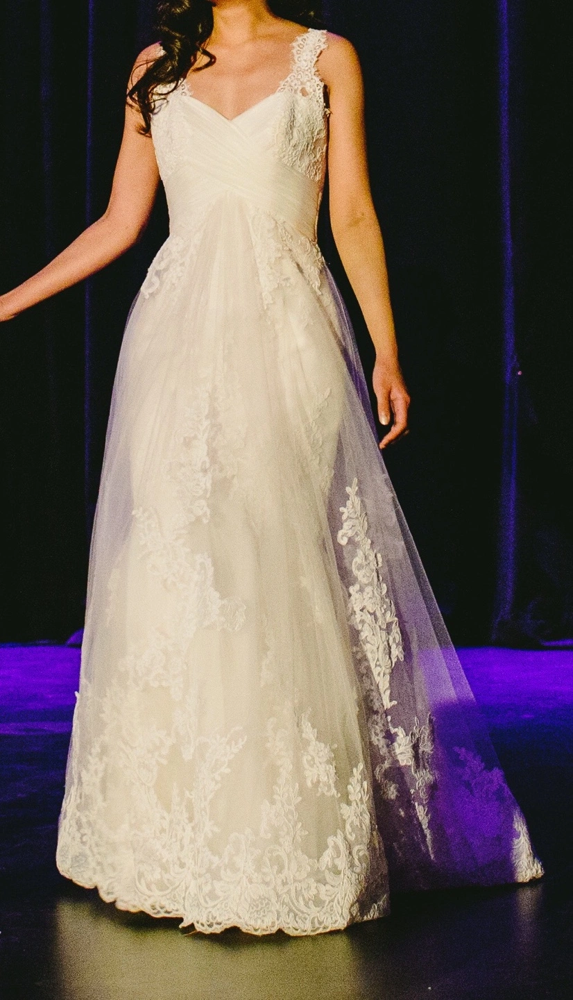 Pronovias “Petunia” style wedding dress in off-white (diamond white). Sweetheart neckline with wrapped criss-cross bodice design detail, lace extending at front to straps, and natural waist. A special feature is the double skirt, where underneath is fit-to-flare with a beautiful lace and tulle overlay, giving a subtle ethereal effect in certain lighting. French Alencon lace and tulle fabrics throughout. Purchased new, worn once. US size 4 (you may refer to my measurements below). Length was altered to my height of 5’5” + 3” heels, and back straps were moved slightly closer towards center back to prevent shoulder strap slippage. There is also a way to bustle the train, which I did for the reception. Gown has been professionally cleaned, oxidized and preserved neatly in box. I am throwing in the handmade, cathedral length tulle cape with lace trim, as it was included in the cleaning package. I wore it pinned at my shoulder points for the ceremony and removed for the reception (should you choose to use it). Also included in the box is the garment bag. My measurements: Bust-Waist-Hips: 33-27-38 Street/US dress size: 4 Bra size: 32B Pant size: 27 Height: 5’5” Box measurements: 31 ¾” L x 19 ½” W x 7 ½” D *Pick-up near Taunton/Audley in Ajax