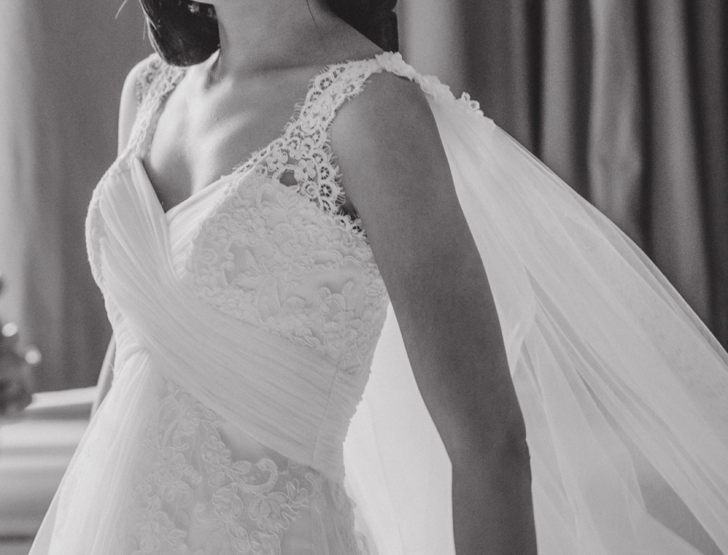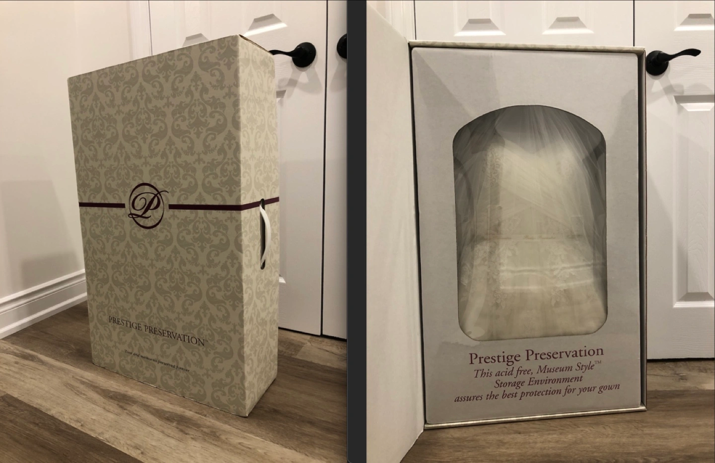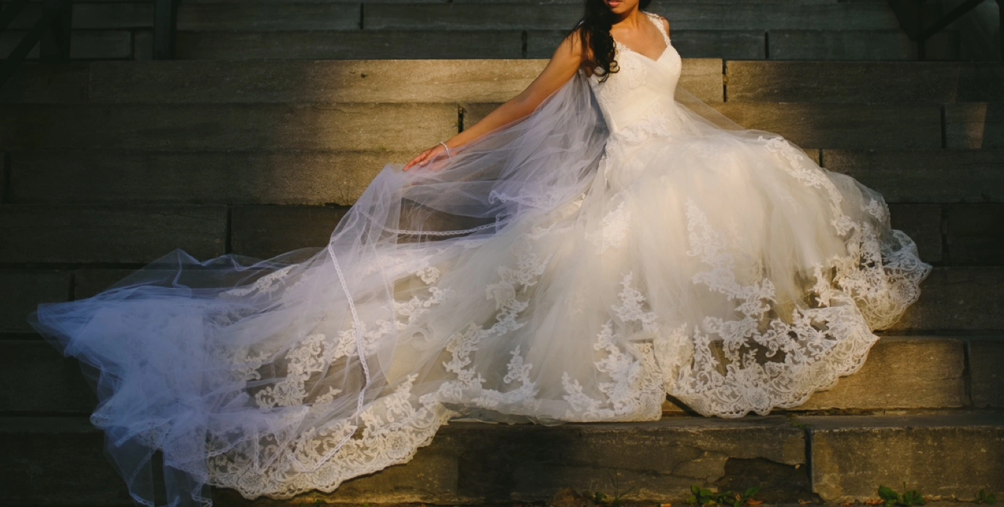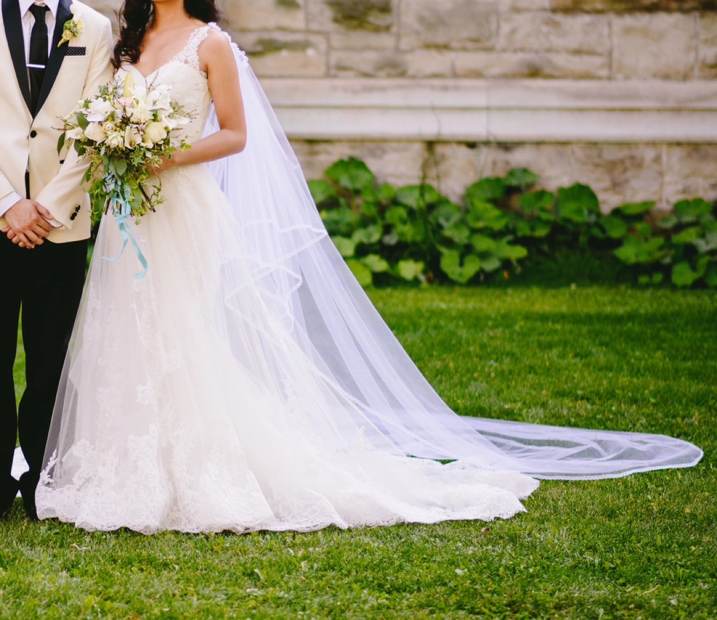 Pronovias “Petunia” style wedding dress in off-white (diamond white). Sweetheart neckline with wrapped criss-cross bodice design detail, lace extending at front to straps, and natural waist. A special feature is the double skirt, where underneath is fit-to-flare with a beautiful lace and tulle overlay, giving a subtle ethereal effect in certain lighting. French Alencon lace and tulle fabrics throughout. Purchased new, worn once. US size 4 (you may refer to my measurements below). Length was altered to my height of 5’5” + 3” heels, and back straps were moved slightly closer towards center back to prevent shoulder strap slippage. There is also a way to bustle the train, which I did for the reception. Gown has been professionally cleaned, oxidized and preserved neatly in box. I am throwing in the handmade, cathedral length tulle cape with lace trim, as it was included in the cleaning package. I wore it pinned at my shoulder points for the ceremony and removed for the reception (should you choose to use it). Also included in the box is the garment bag. My measurements: Bust-Waist-Hips: 33-27-38 Street/US dress size: 4 Bra size: 32B Pant size: 27 Height: 5’5” Box measurements: 31 ¾” L x 19 ½” W x 7 ½” D *Pick-up near Taunton/Audley in Ajax