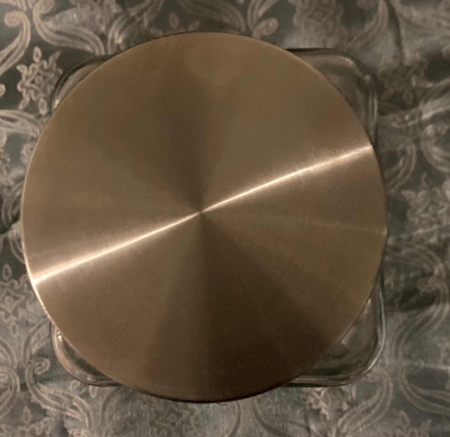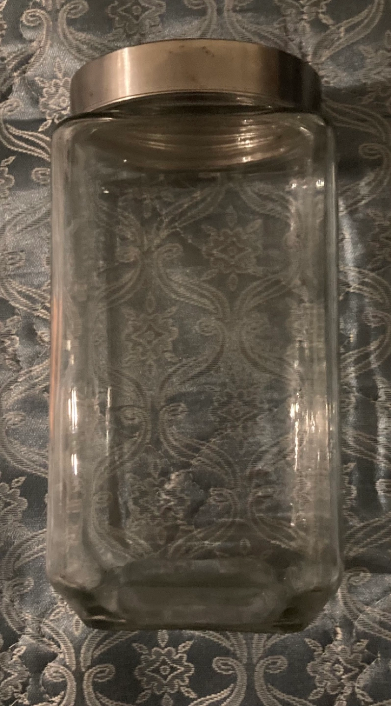 Large glass jar with a metal lid. Perfect for storing dry goods like flour, sugar, or pasta.