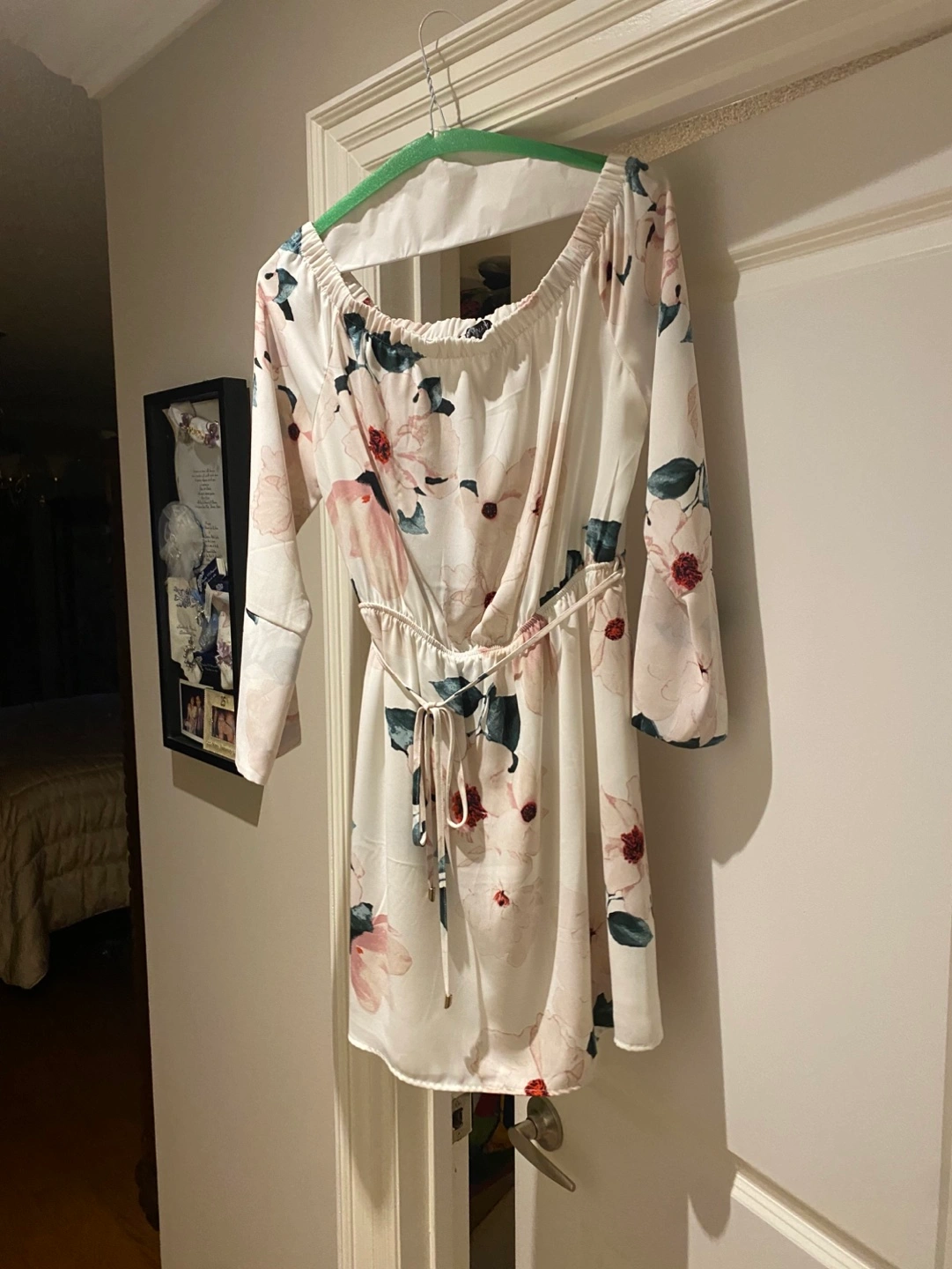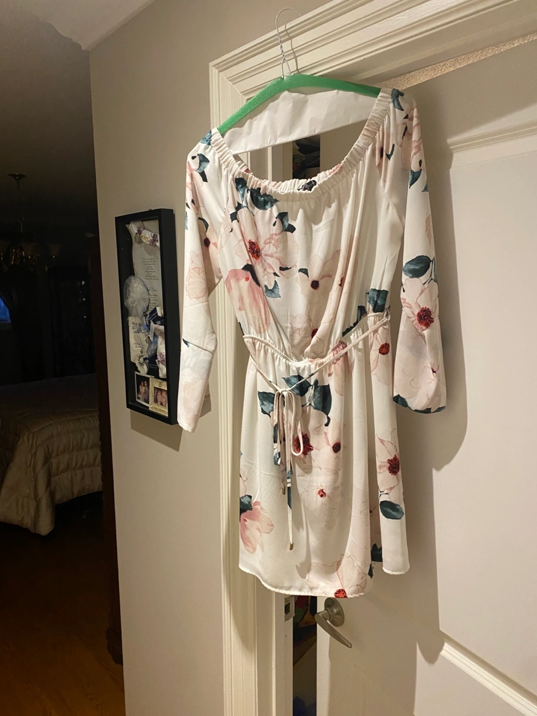 Off the shoulder dress with a floral print. It has a tie waist. Size is small but loose fitting.