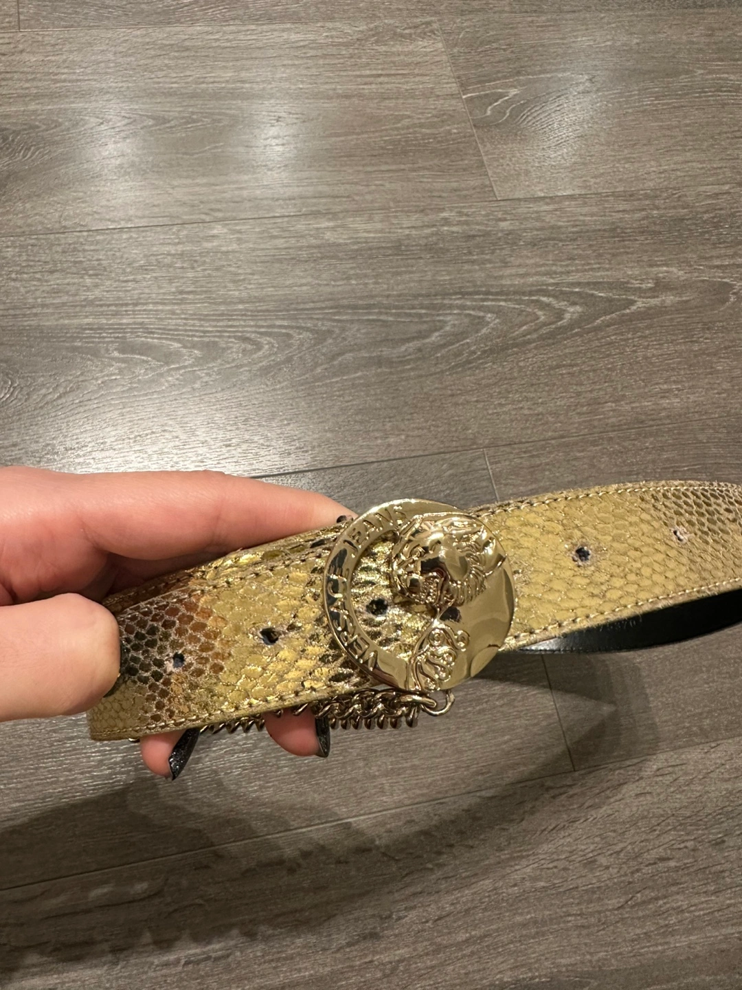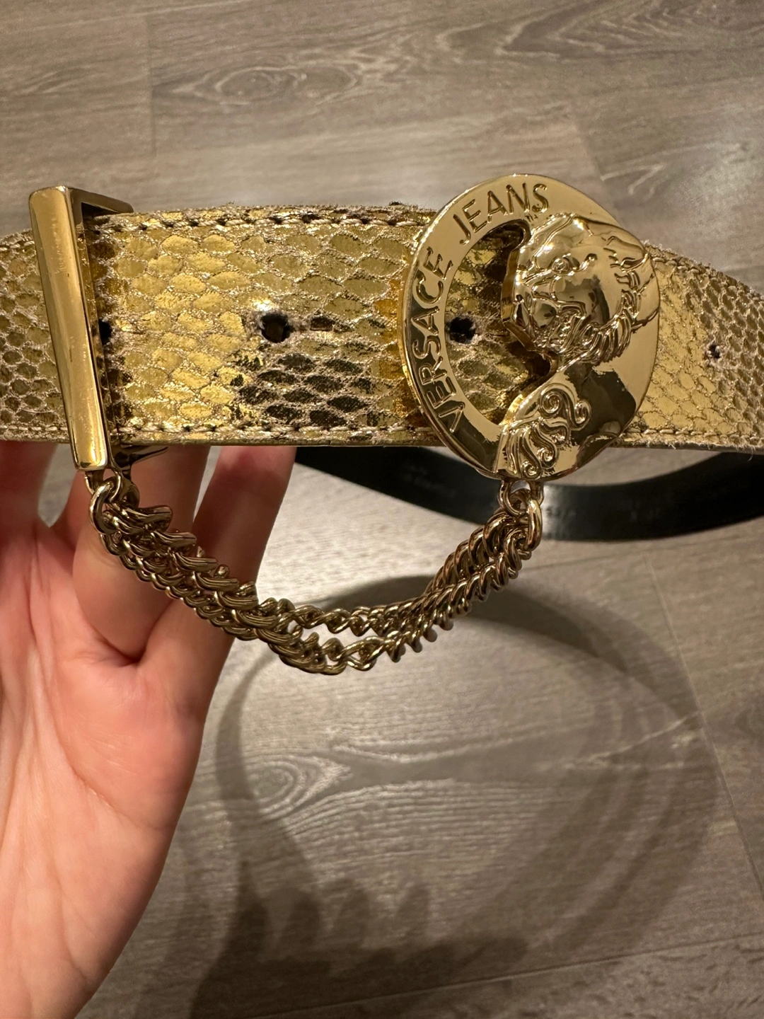 Versace Jeans Belt Gold 90 cm leather mix Great pre-owned condition the length from beginning ( where buckle) till first hole 72cm and till last hole 85cm Please check all photos and ask questions Big closet clean out