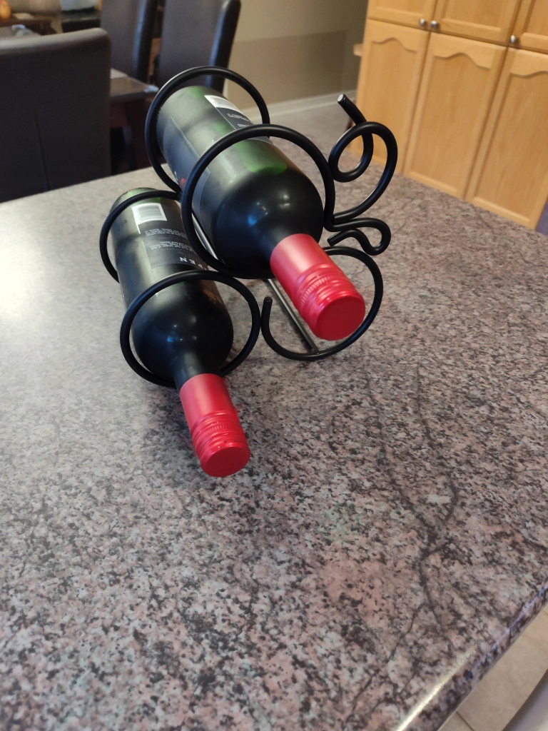 Black metal wine rack. Holds up to three bottles elegantly. Matt black color. New condition. Placed bottles are for display purposes only and are not included. Pick up in Lisgar area Mississauga.