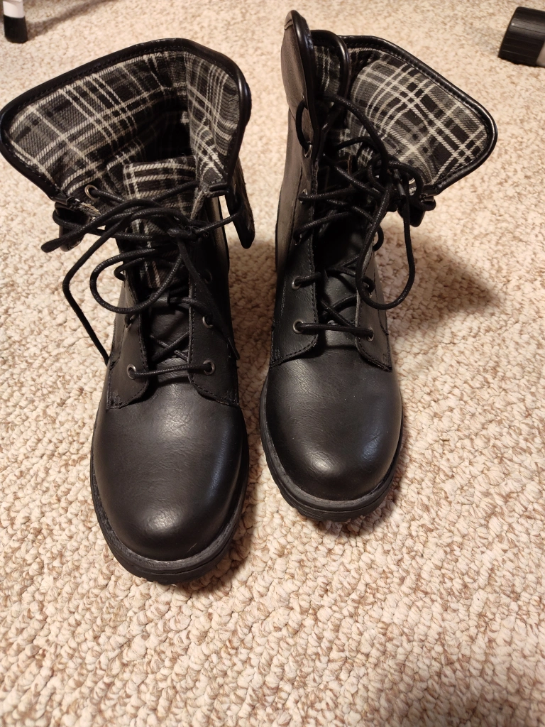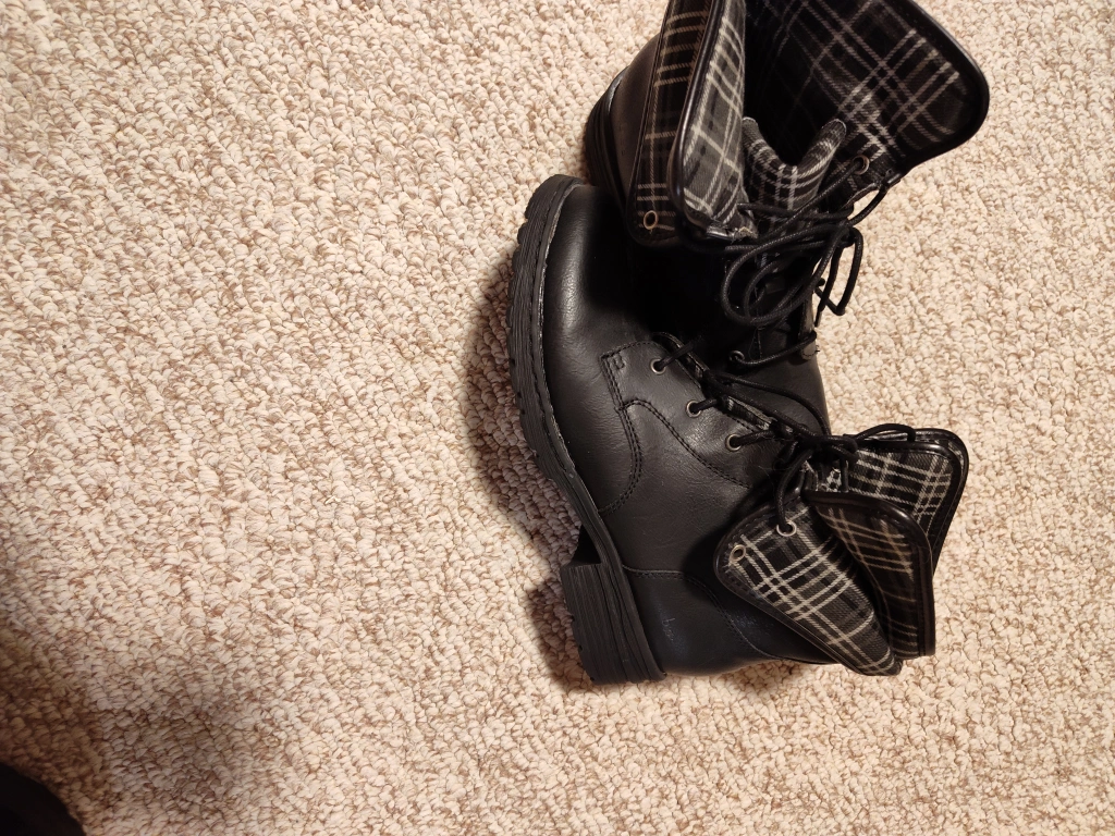Black lace-up boots with a plaid lining. Size 8. Never worn. Clearing out excess clothes. Pick up in Lisgar area Mississauga. Asking $25. obo