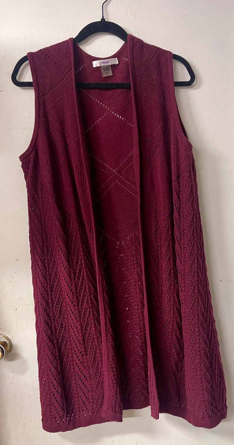 Brand: ALIA Item: Open front, Knit sleeveless long vest. Colour: burgundy size: L/G Condition: Like New Add a pop of color to an outfit,goes well with short or long sleeve shirts and jeans,leggings,skinny pants,or even looser blouses and pants,also over different tops from casual to dressy,will definitely be a spring/summer staple for the office or lounging If you are interested feel free to message me. Thanks.