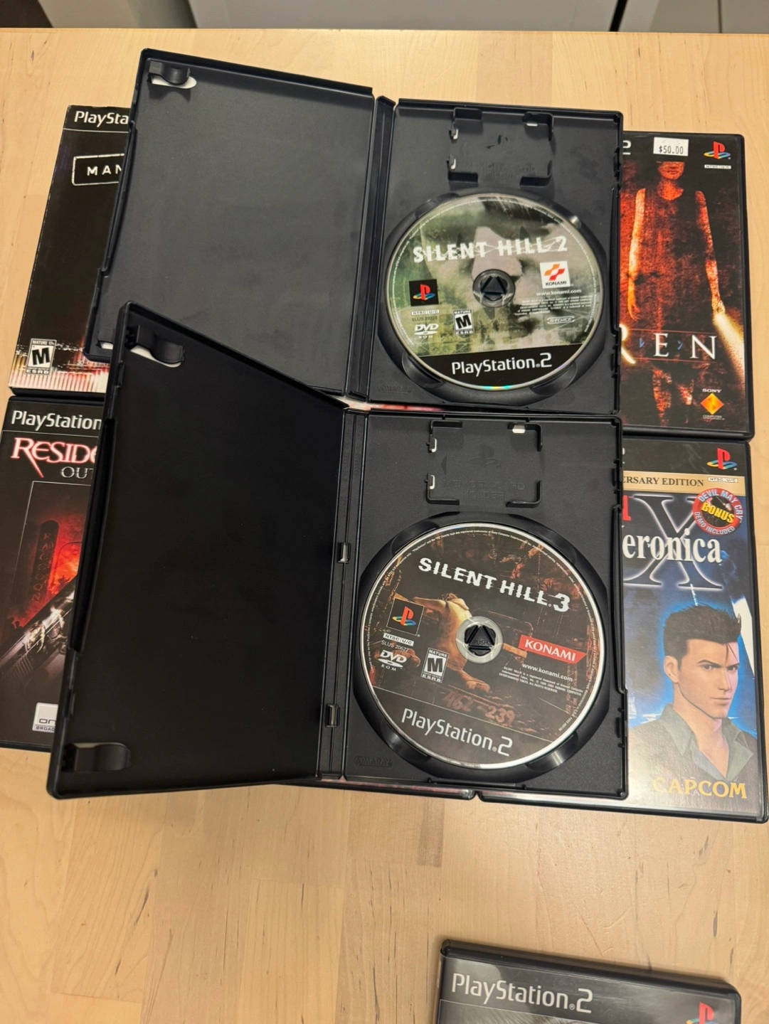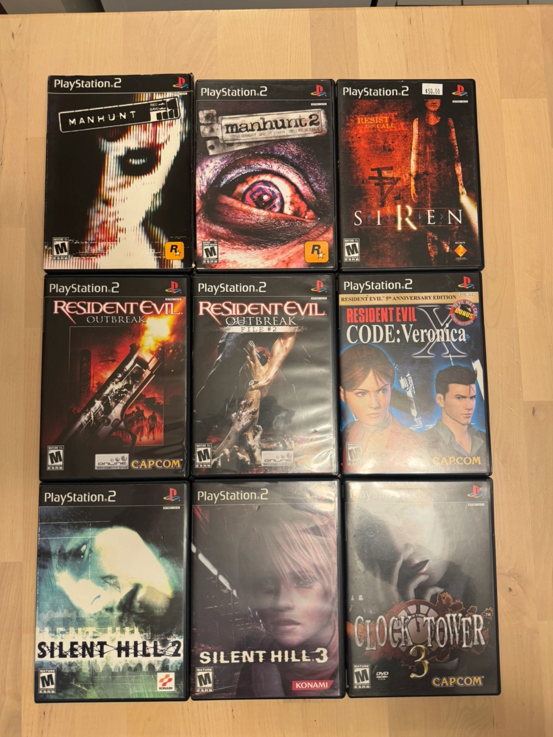 Rare PlayStation 2 Horror Titles Everything is tested and working. Everything is complete in box except for silent hill 2 & 3 Manhunt W/ Slipcover - (SOLD) Manhunt 2 - $100 Siren - $100 Resident Evil Outbreak - $45 Resident Evil OutBreak #File2 - $80 Resident Evil Code Veronica Capcom Anniversary Edition W/ DMC Demo Disc & Wesker’s Report Disc - $80 Silent Hill 2 $180 Silent Hill 3 $250 Clock Tower 3 - $120 Take all for $850 Collection of 10 PS2 horror games. Games include: Clock Tower 3, Resident Evil Code: Veronica, Manhunt, Manhunt 2, Siren, Resident Evil Outbreak, Resident Evil Outbreak File 2, Silent Hill 2, Silent Hill 3, and Clock Tower 3.