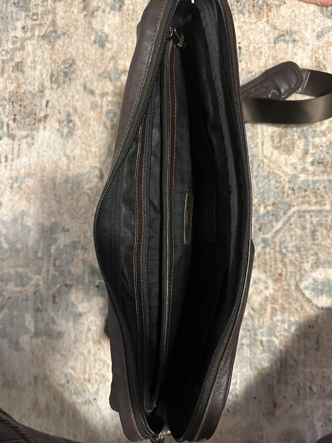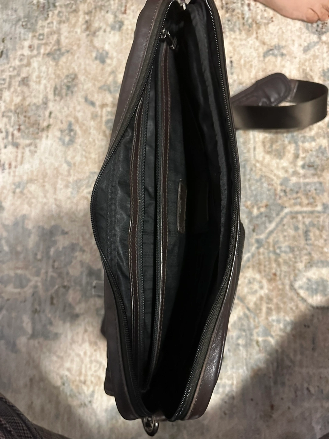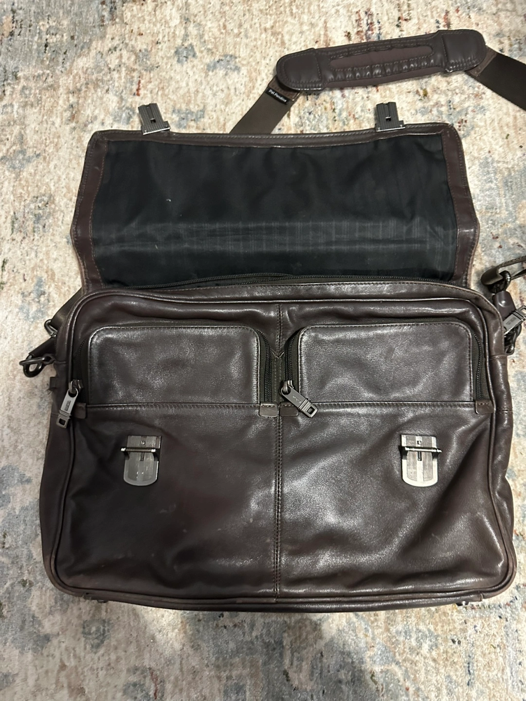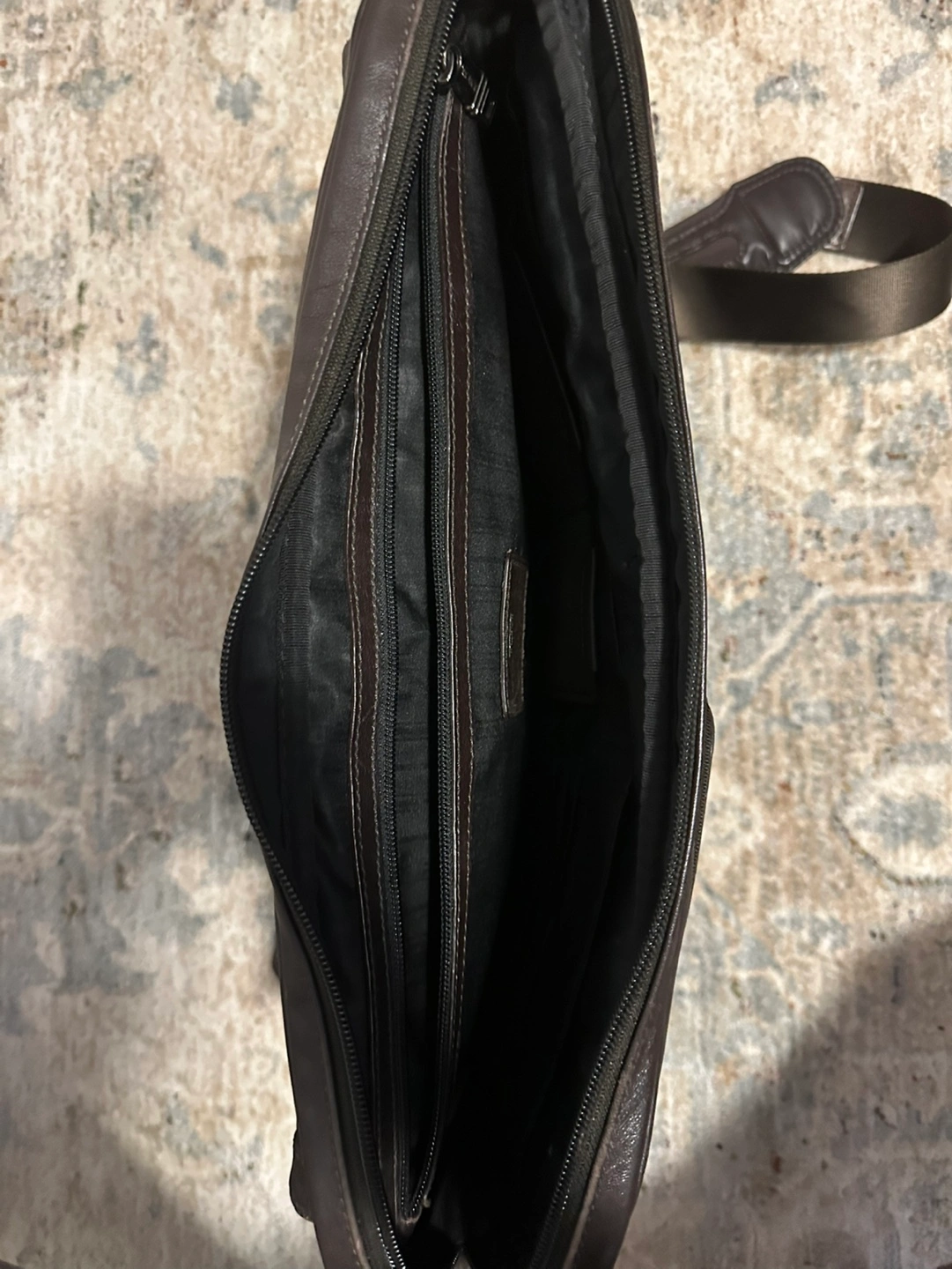 Brown leather briefcase with a shoulder strap. Multiple compartments inside.
