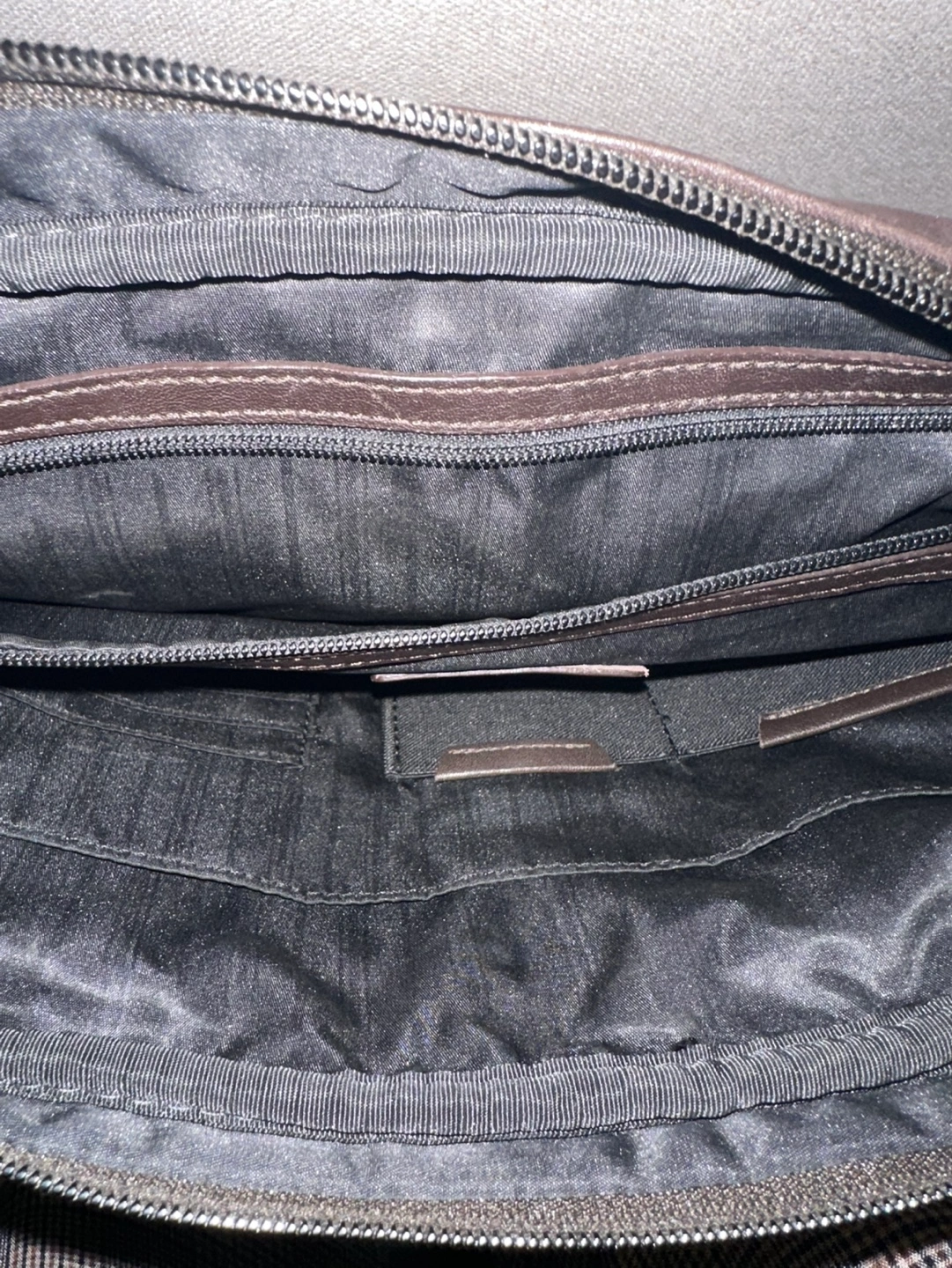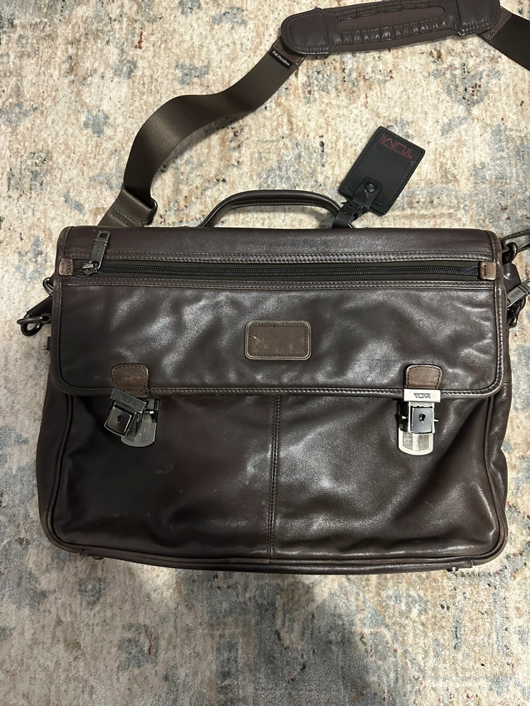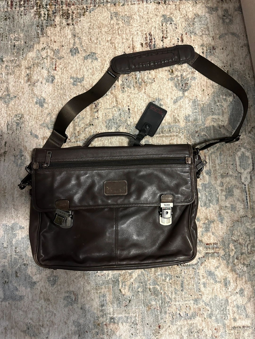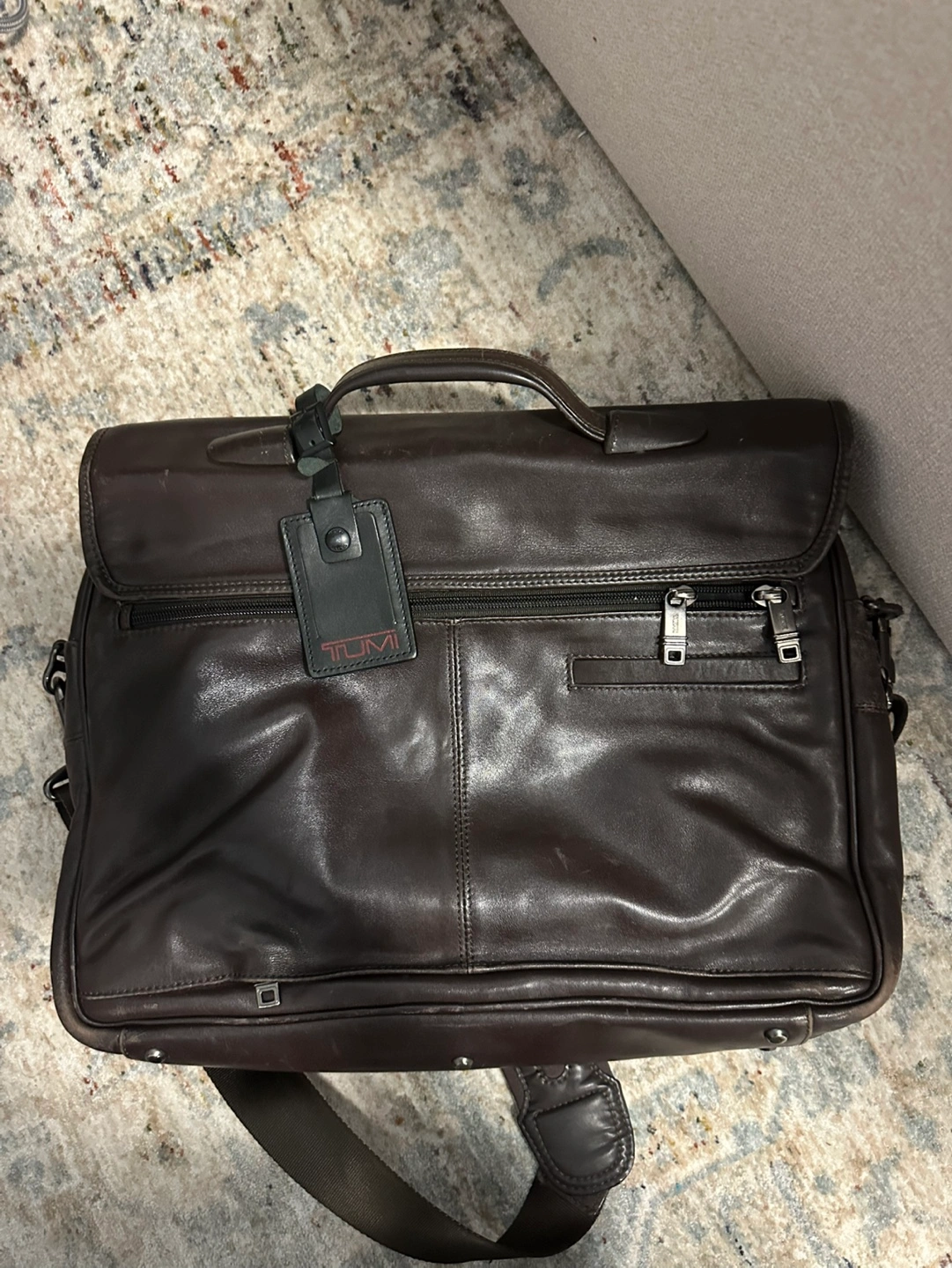 Brown leather briefcase with a shoulder strap. Multiple compartments inside.