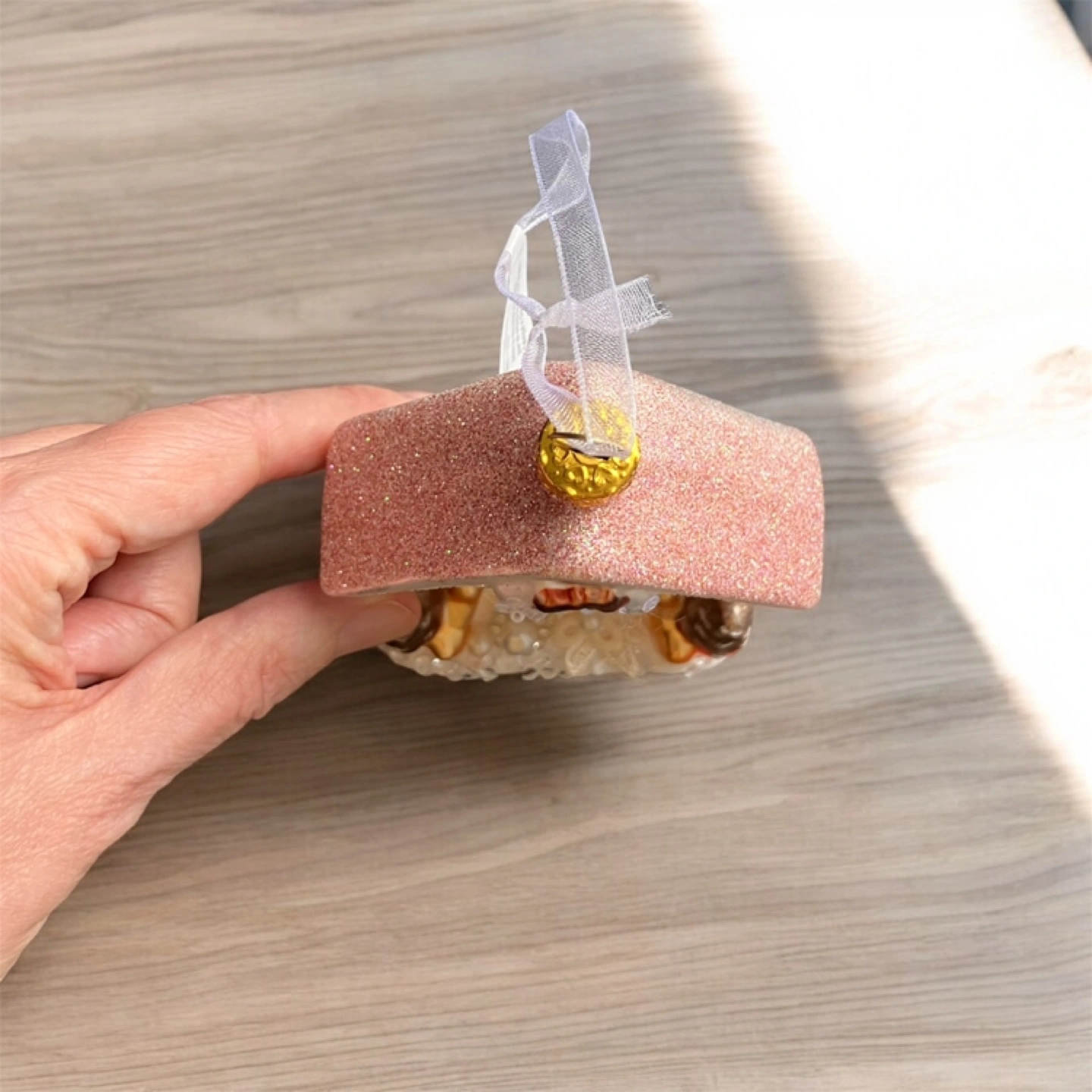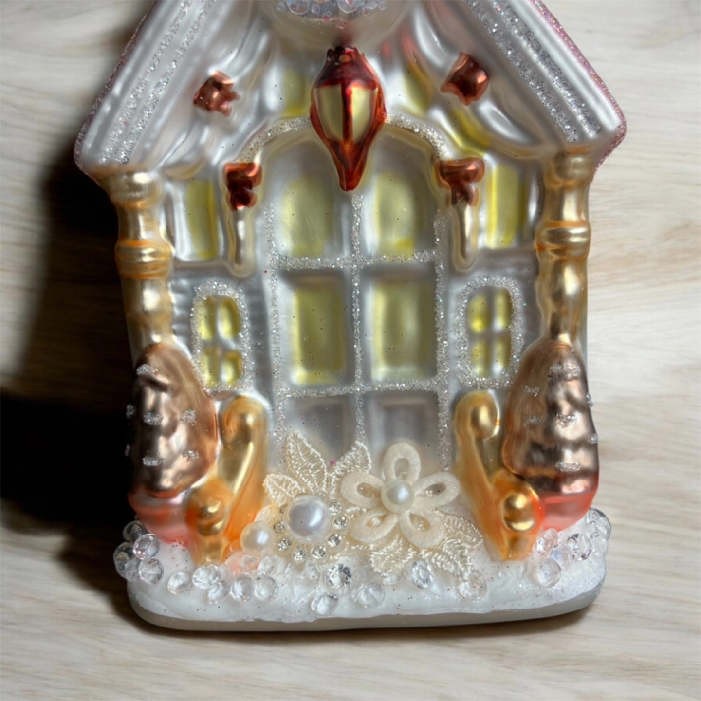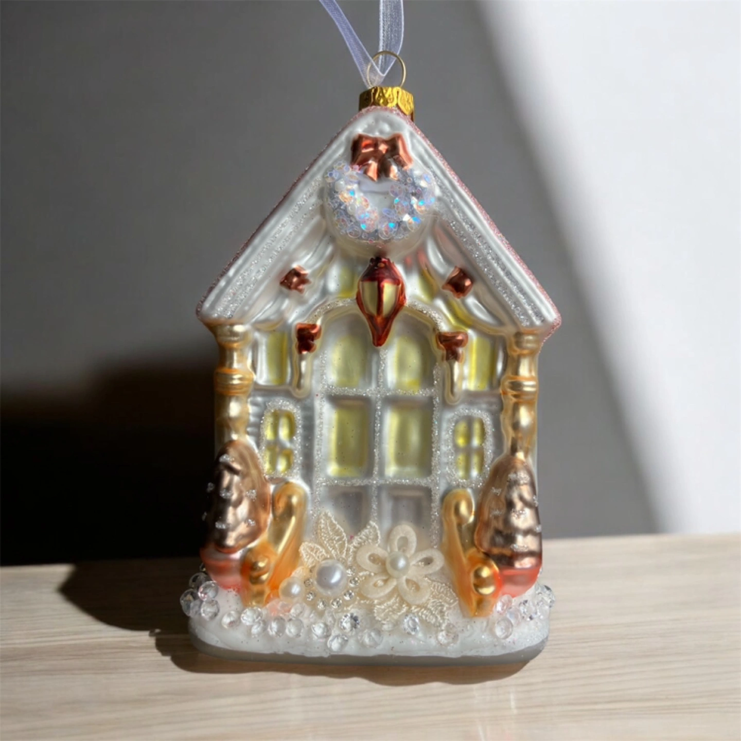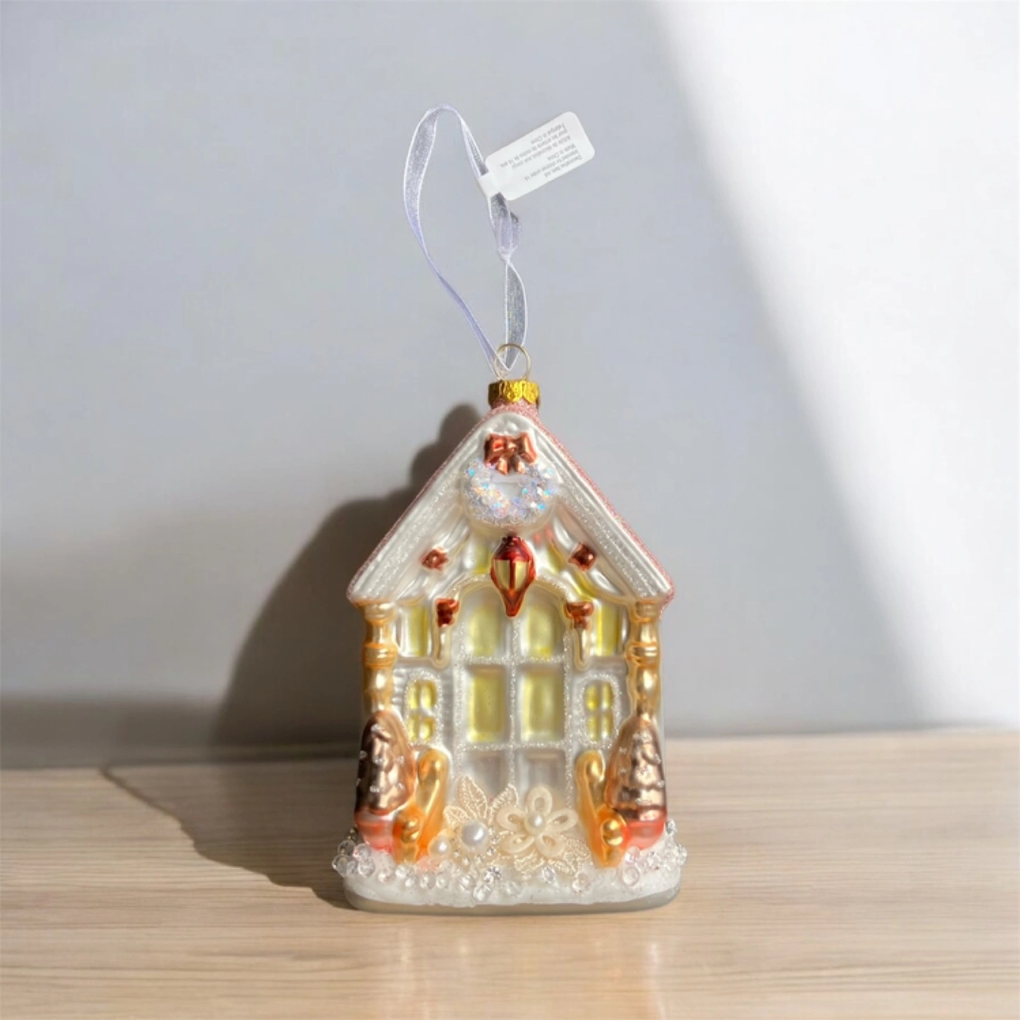 NWT this elegant Christmas tree ornament is the perfect representation of a decorated victorian cottage door with stunning windows and decorative wreath and trees. With beautiful lace and beading to accent the white and gold background. Bring back memories of the Christmas of our childhood and create new ones with the most beautiful and special holiday ornaments. Add a touch of elegance to your holiday decor with this beautiful white and gold ornament. Perfect for creating a festive atmosphere. Measures approximately 5.0" H x 3.0" W (at the widest base). I ship using recycled material within my home to reduce waste. The package will be wrapped with care if requested or deliver for a fee
